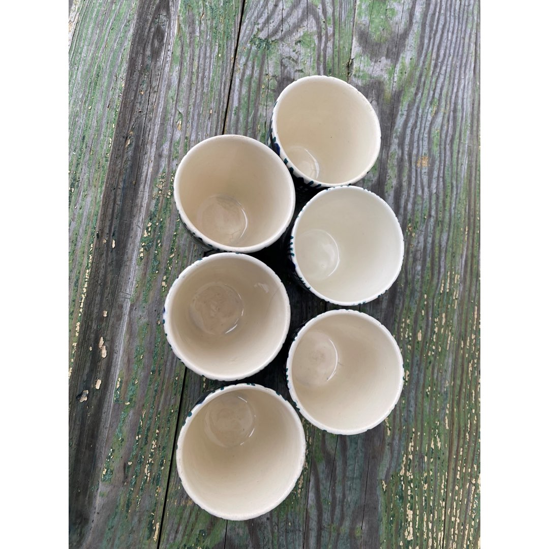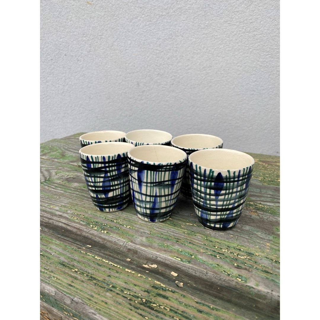 6 fajansowych kubków do wina z Włocławka z lat 60-tych. Sygnowane. Ręcznie malowane. Wzór 411 zatwierdzony w 1958/59 roku. Projekt Jan Sowiński. Wymiary; wys.7 x 6,5 cm. Jeden kubek z włosowatym defektem.