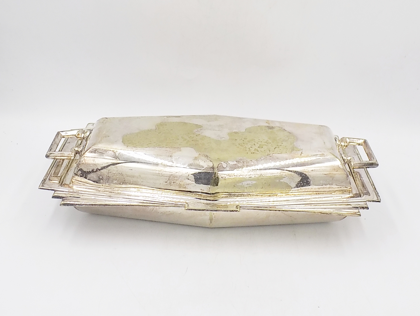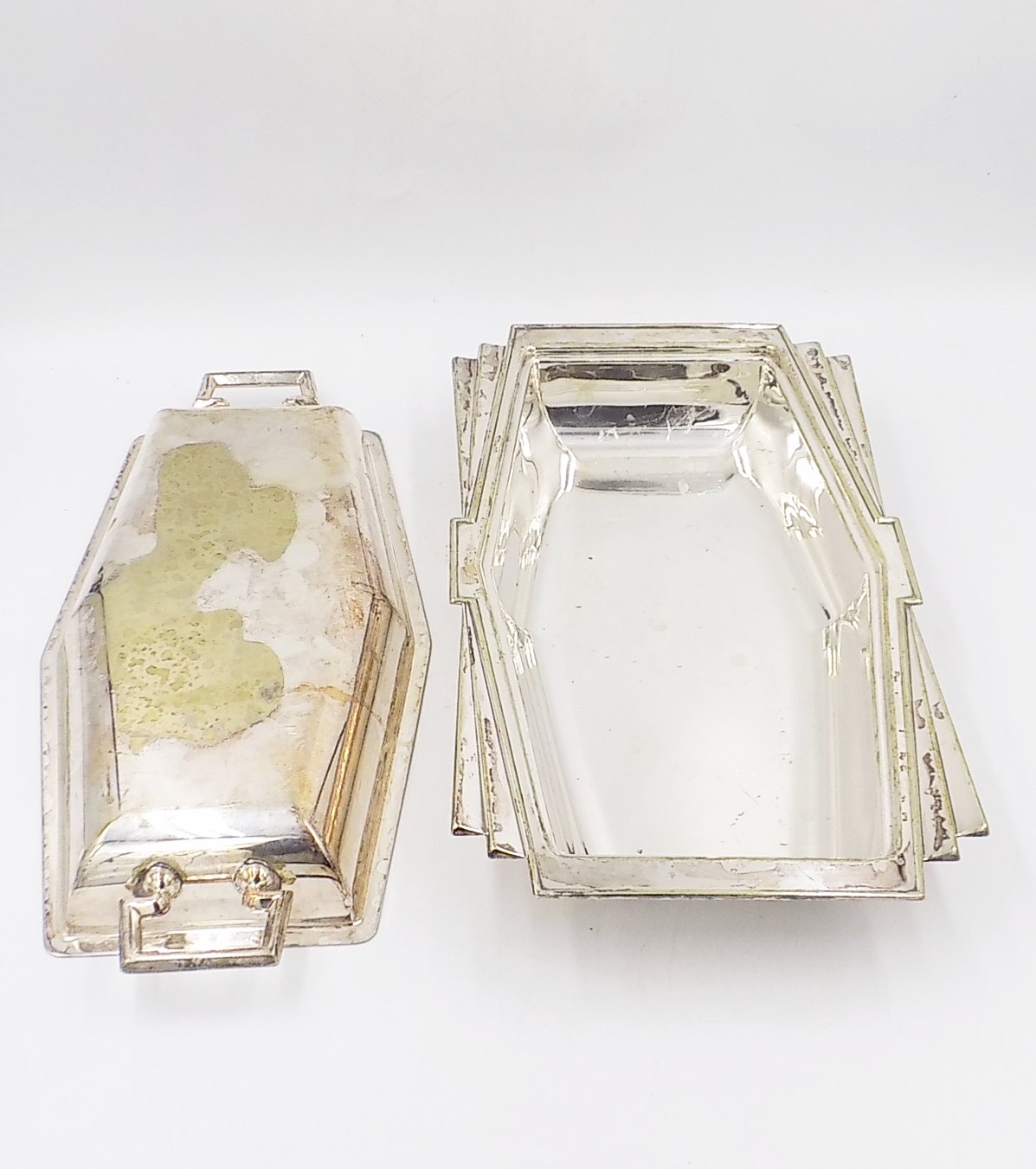 Naczynie platerowane w stylu Art Deco z I poł.XX w. Wymiary; wys.6,5 x 30,5 x 17 cm. Ślady użytkowania