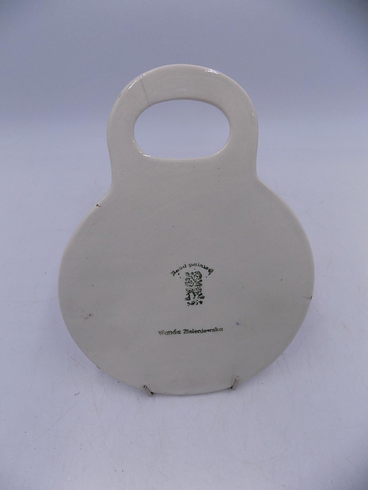 Mamy przyjemność zaprezentować Państwu wyjątkową fajansową deskę pochodzącą z lat 70/80 XX wieku, niosącą ze sobą kunszt artystycznego rzemiosła i niepowtarzalny urok. Ten niezwykły przedmiot z Włocławka stanowi autentyczny zapis twórczości tamtego okresu, podkreślając nie tylko walory estetyczne, ale również wartość historyczną.