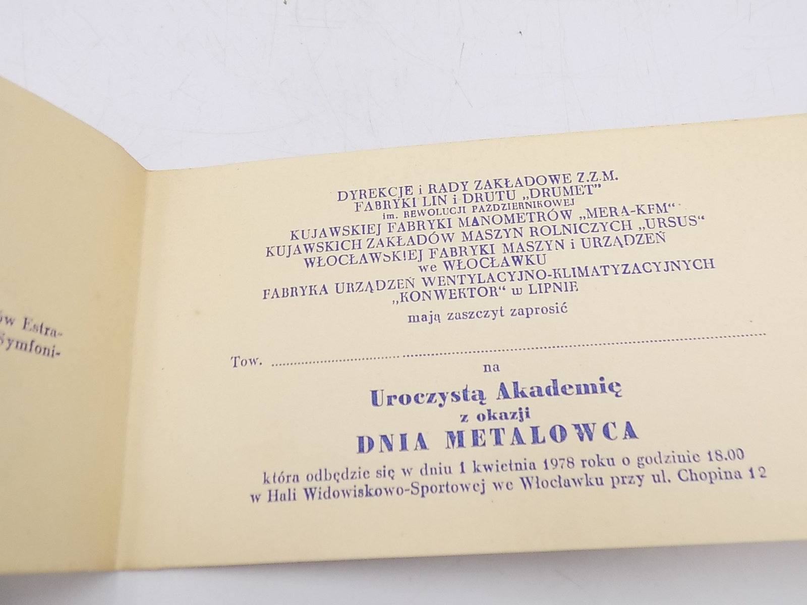 DZIEŃ METALOWCA Drumet Włocławek Mera-KFM URSUS Konwektor Lipno ZAPROSZENIE PRL