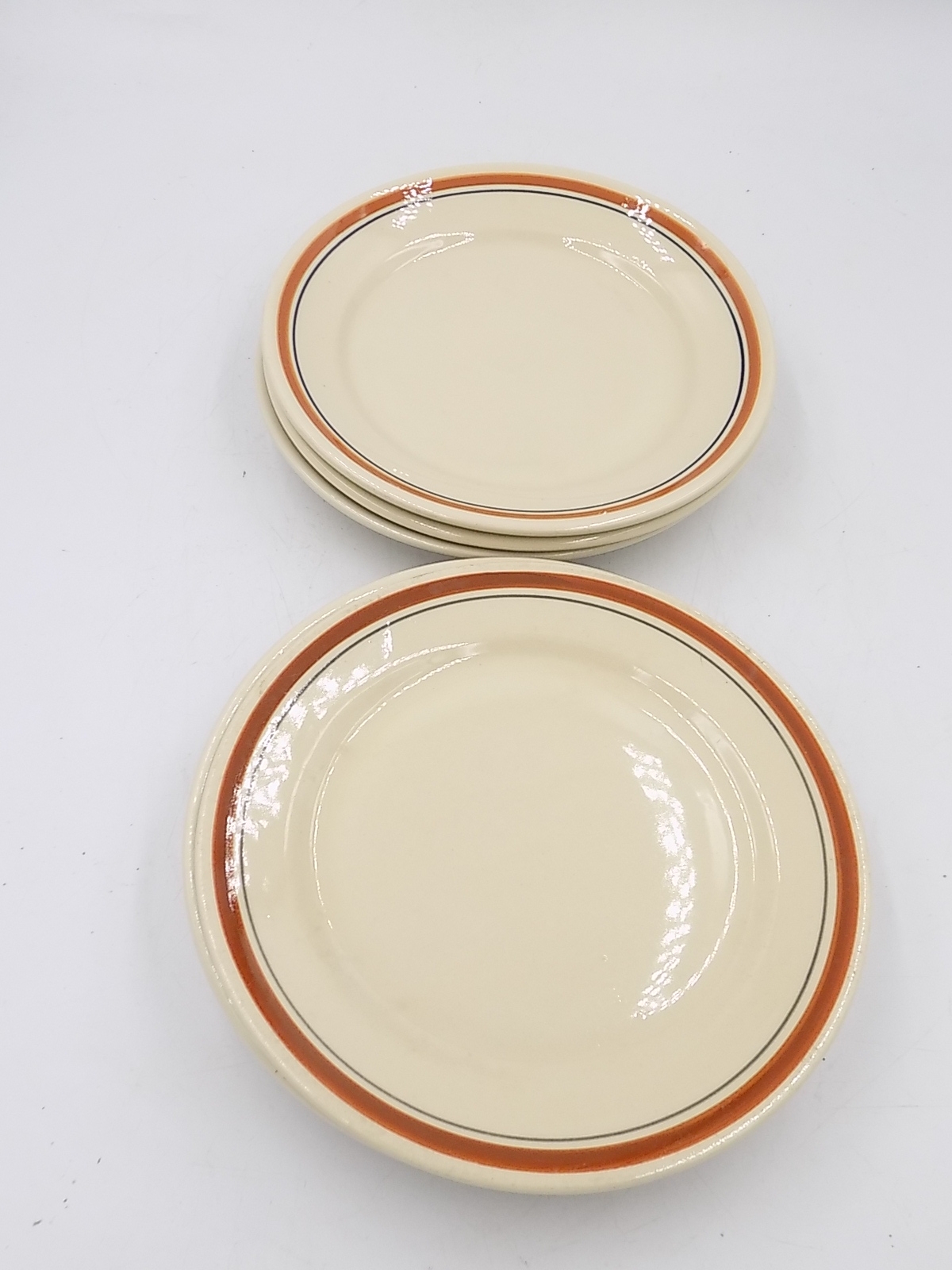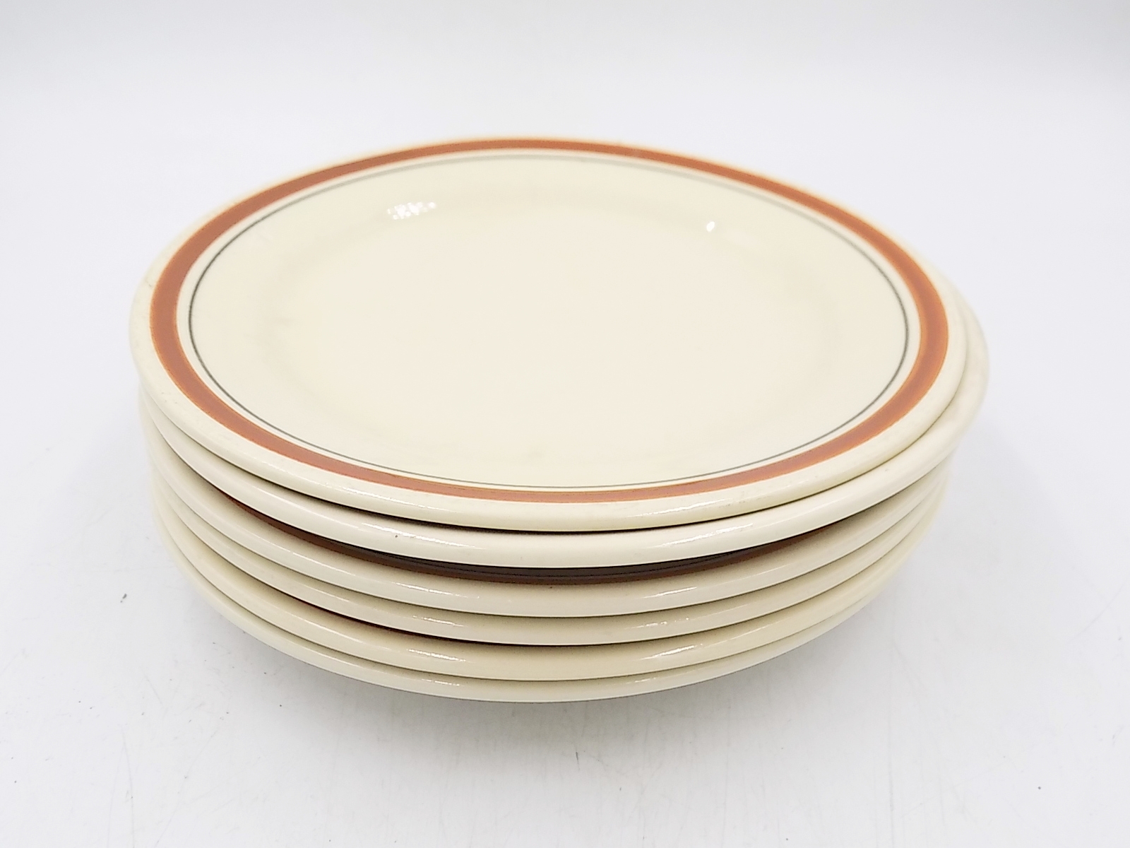 6 fajansowych talerzy deserowych z paskiem z Włocławka z lat 50-tych. Sygnowane. Wymiary; 19,5 cm. Ślady użytkowania