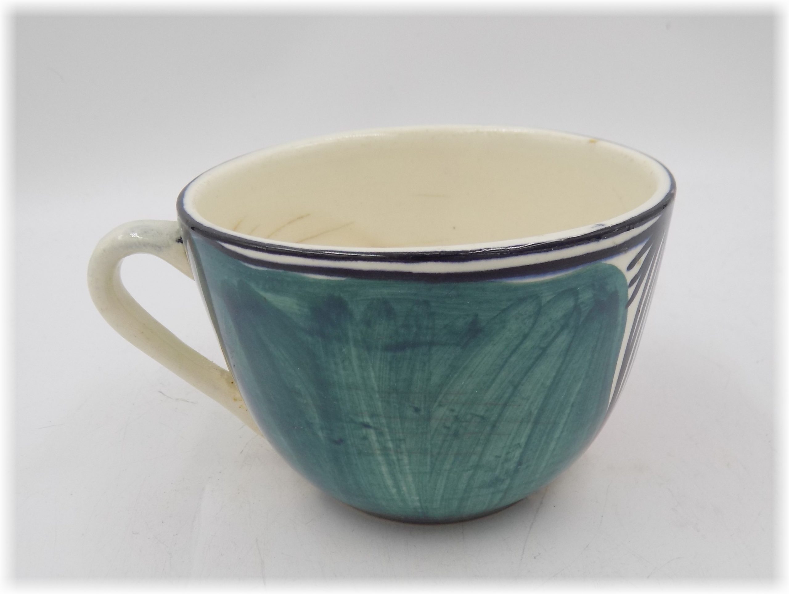 Fajansowa filiżanka z laat 50/60-tych. Sygnowana. Ręcznie malowana. Wymiary; wys.6 x 9 cm. Przebarwienie i widoczny harys.