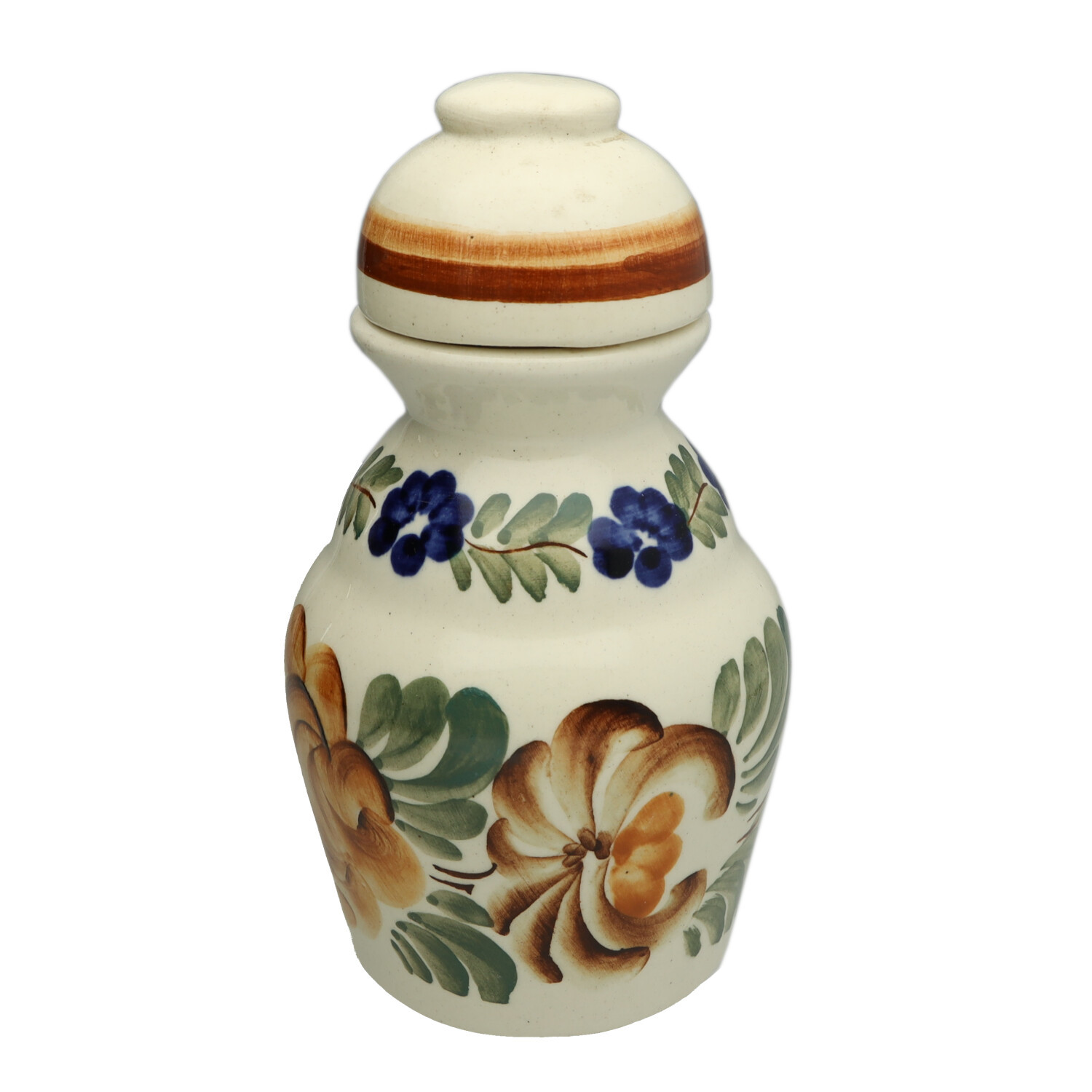 Fajansowa puszka z Włocławka z lat 70/80-tych. Sygnowana. Ręcznie malowana. Wzór 1411 zatwierdzony w 1977 r. Projekt Barbara Skrzypacz. Wymiary; wys.13 cm. /O.