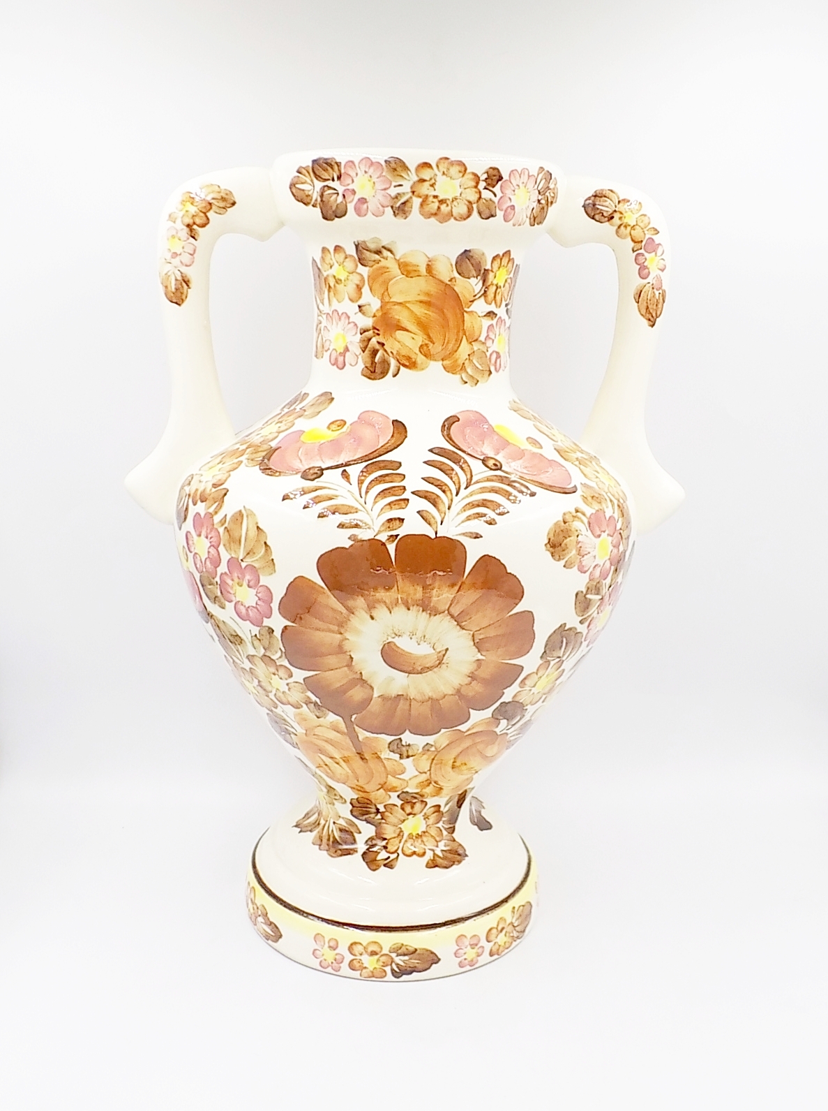 Fajansowy wazon z Włocławka z lat 70/80-tych. Sygnowany. Ręcznie malowany. Wzór 1148 zatwierdzony w 1971 r. Wymiary;wys.41 x szer.31 cm.