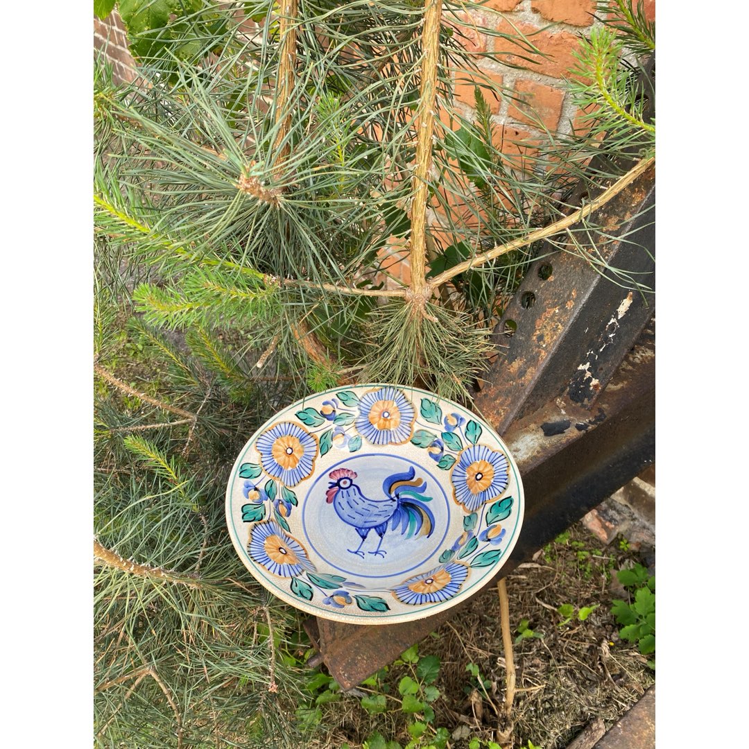 Fajansowy talerz dekoracyjny z Włocławka z lat 60/70-tych. Sygnowany. Ręcznie malowany. Przebarwienia i harys. Wymiary; wys. 5,5 x 25 cm.
