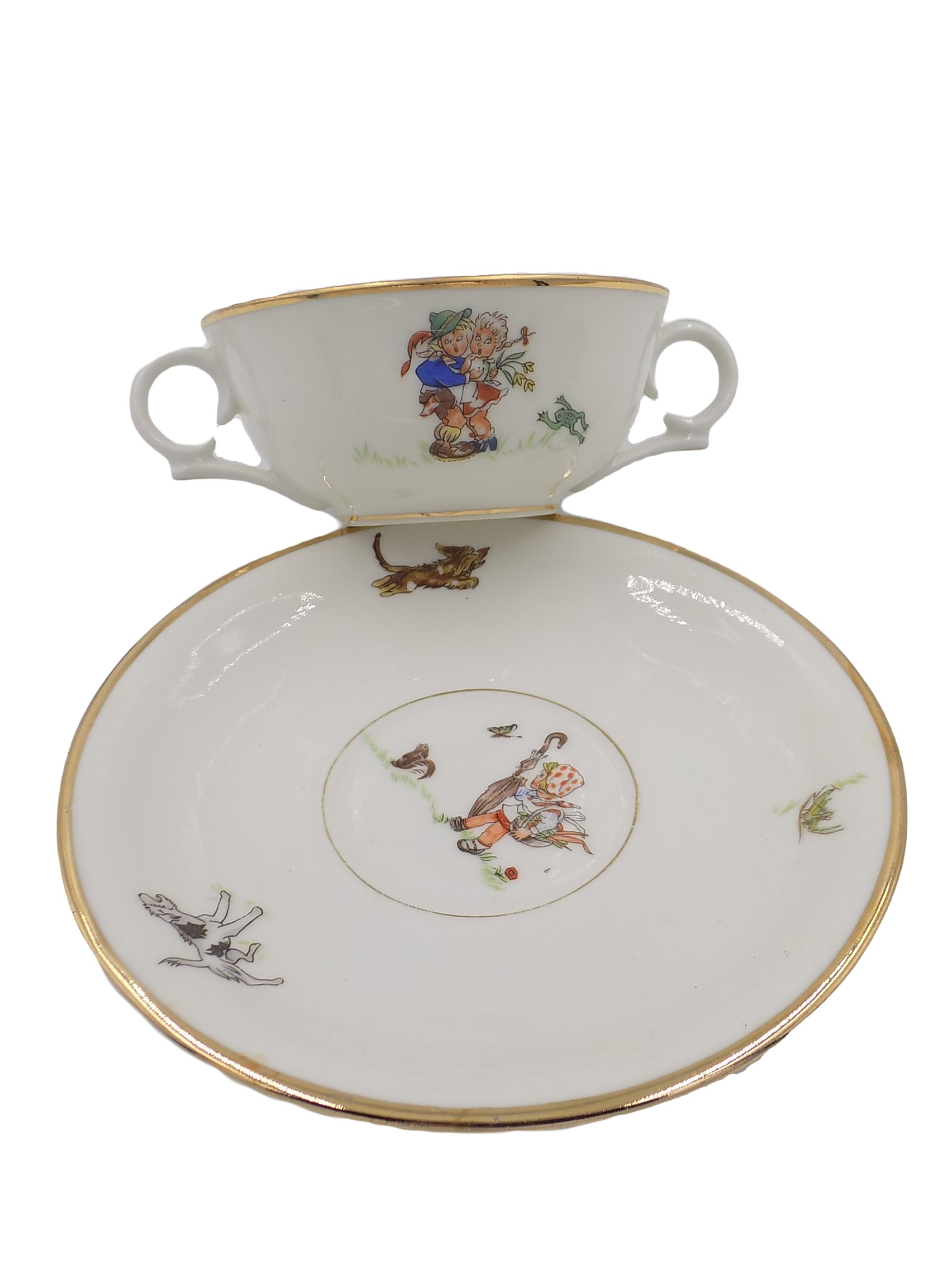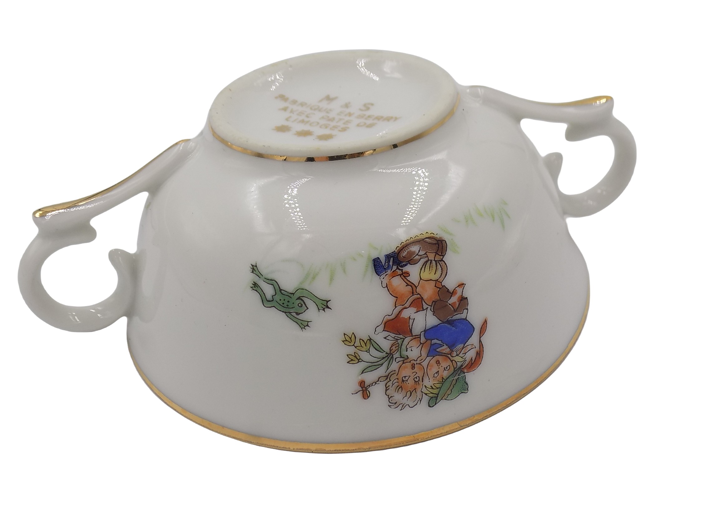 Początki fabryki porcelany w Berry France sięgają roku 1799. Prawo do używania nazwy Limoges uzyskała w latach 60-tych. Trudno datować przedmiotową filiżankę ale prawdopodobnie pochodzi z przełomu 60/70-tych lat. Ciekawa dekoracja będzie stanowić ciekawe uzupełnienie każdej kolekcji filiżanek. Sygnowana. Wymiary; wys.4,5 x 10 cm, spodek 15 cm
