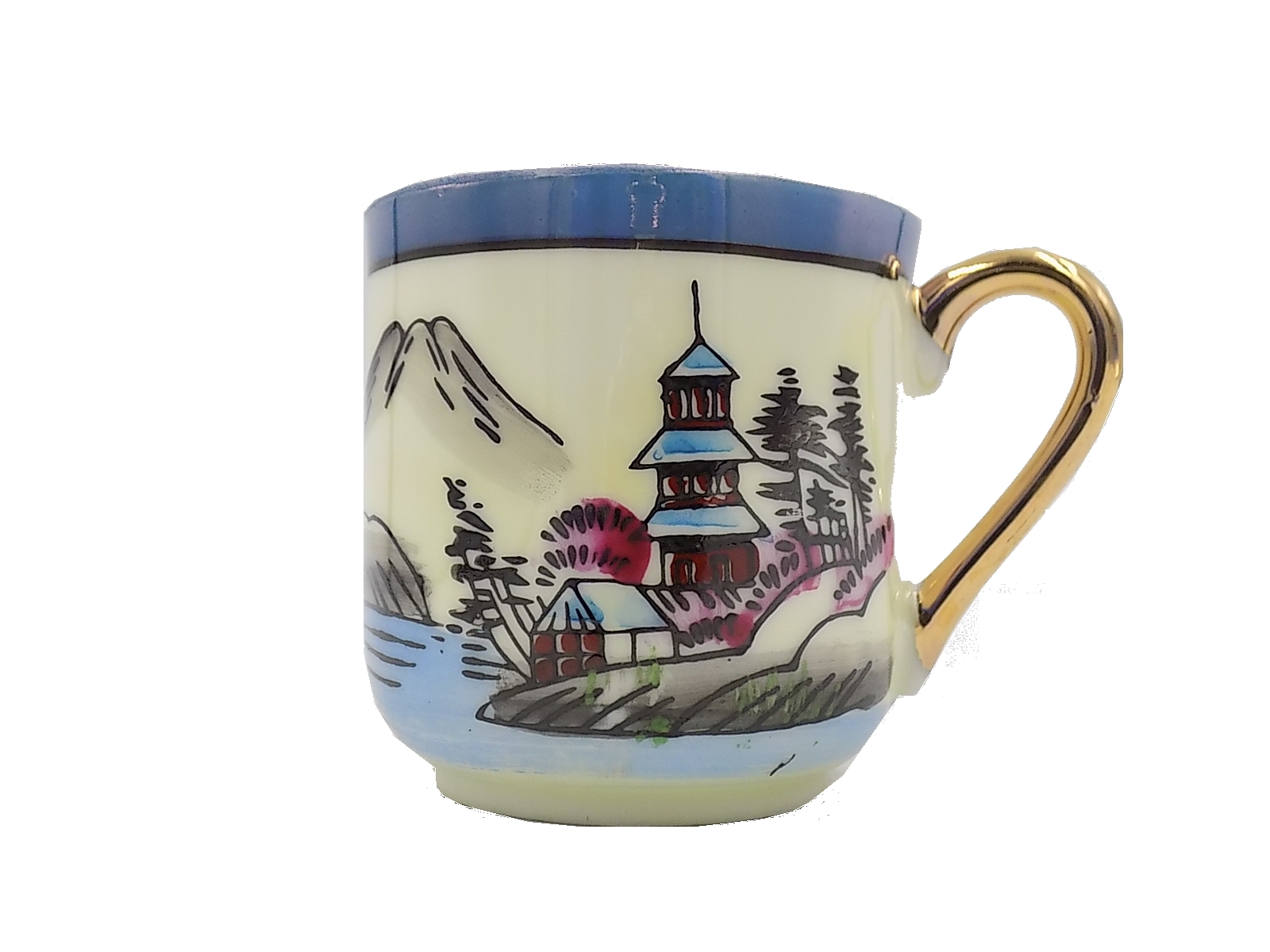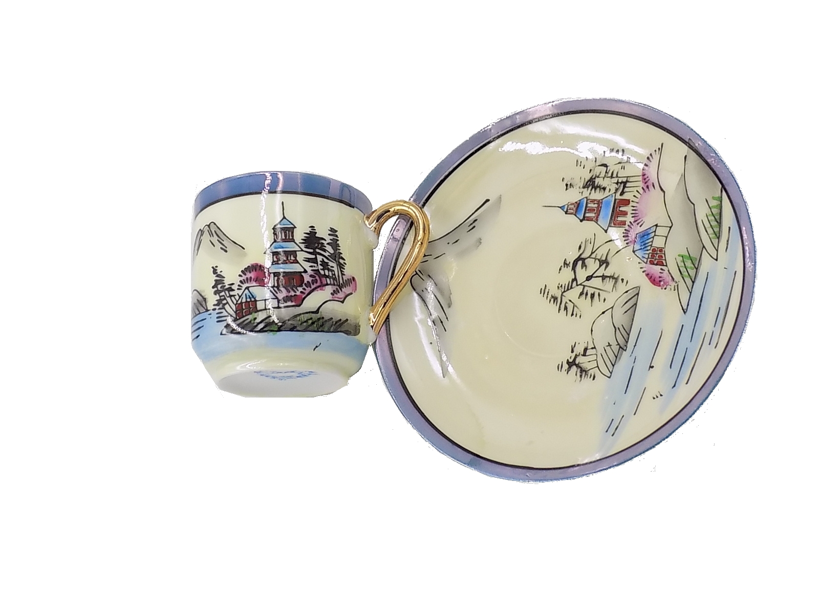 Filiżanka prawdopodobnie z lat 50-tych. Sygnowana. Ręcznie malowana. Wymiary; wys.5,8 x 5,5 cm, talerzyk 11 cm.