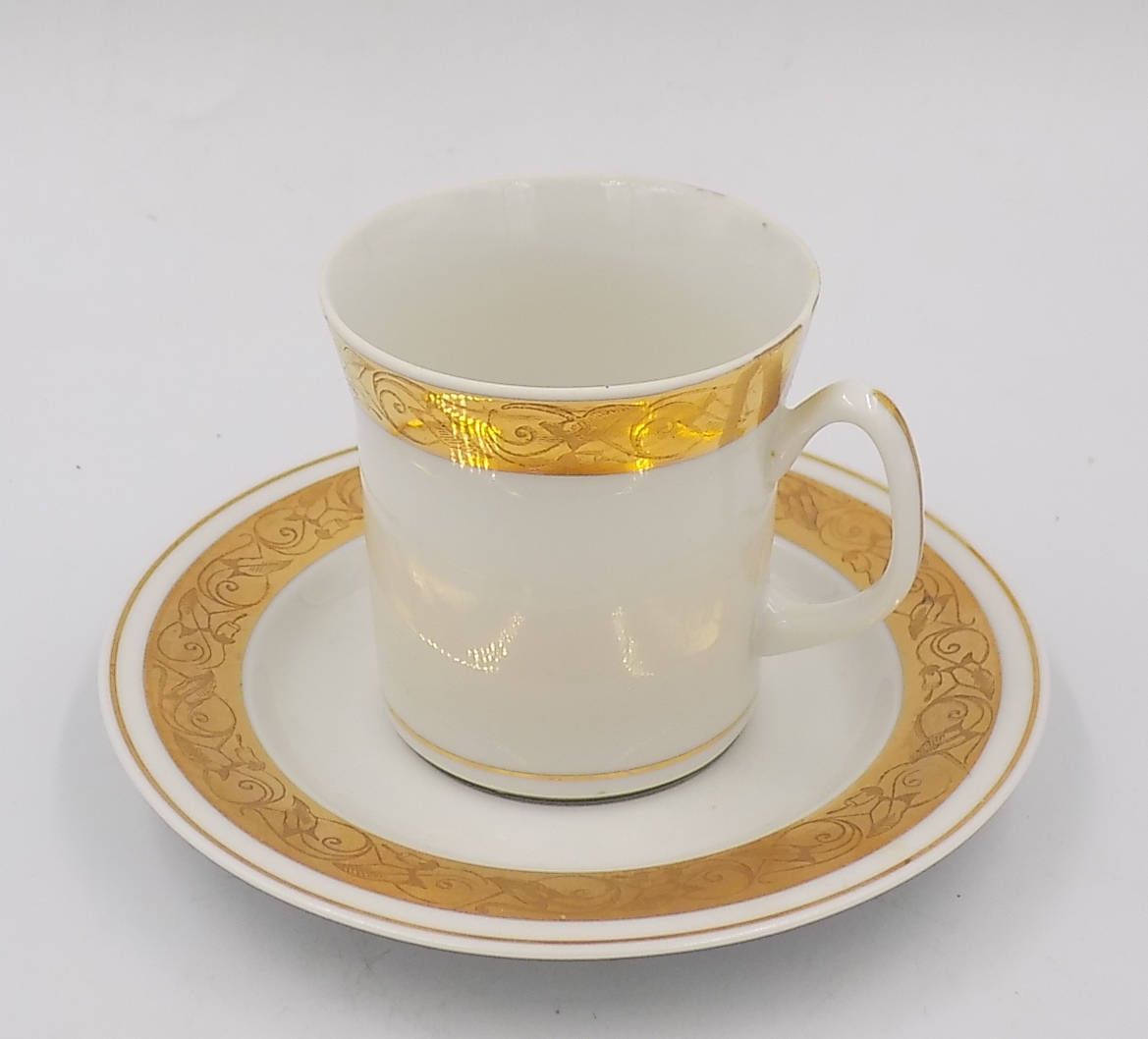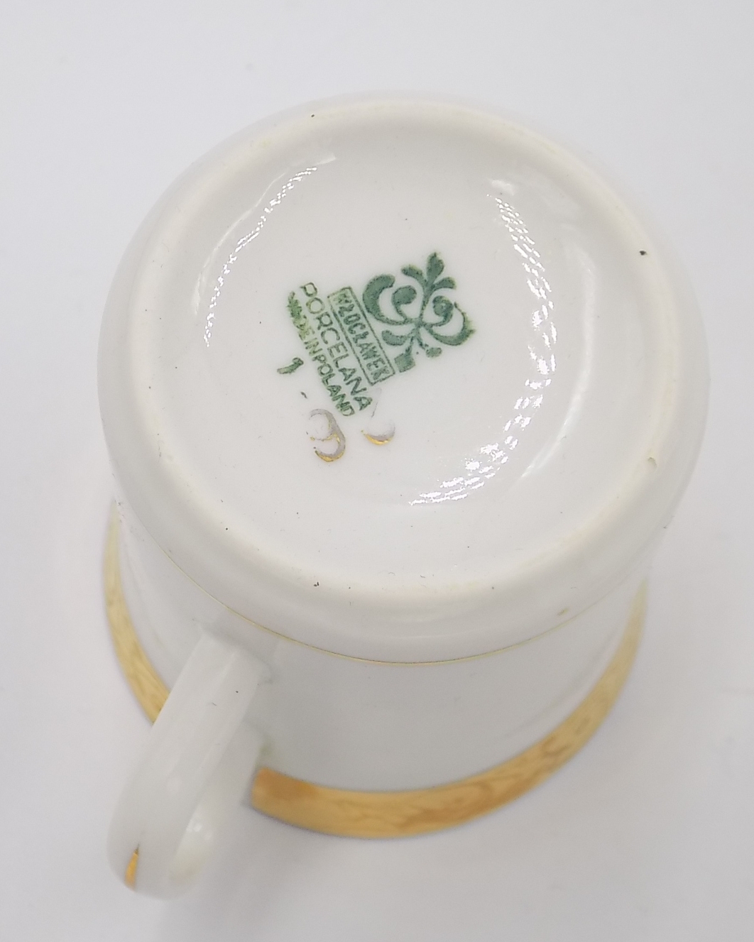 Porcelanowa filiżanka z Włocławka z II poł.XX w. Wymiary; wys.6,5 x 6 cm, spodek 13 cm.