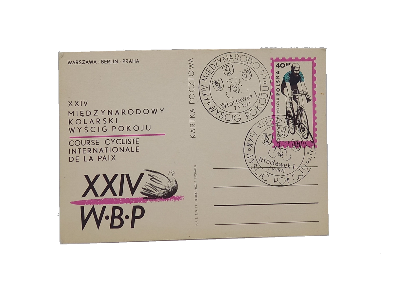 Karta pocztowa z okolicznościowymi stemplami z XXIV Międzynarodowego Wyścigu Pokoju Włocławek 1971 r. Wymiary; 14,5 x 10 cm