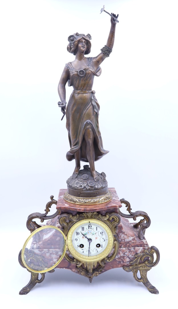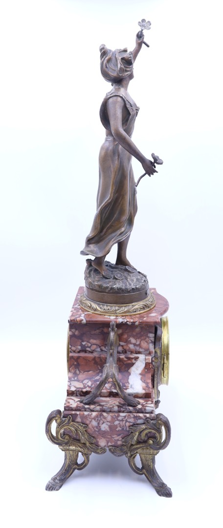 Podstawą tego wyjątkowego zegara jest marmurowa podstawa, która nie tylko nadaje mu solidności, ale także podkreśla jego luksusowy charakter. Postać znajdująca się na zegarze została odlana z najwyższą dbałością o szczegóły, nadając im autentycznej elegancji i niepowtarzalnego uroku. Każdy szczegół wyróżniający figury jest mistrzowsko wykonany, dzięki czemu zegar ten jest nie tylko urządzeniem pomiarowym, ale także prawdziwym dziełem sztuki. Nad zegarem dominuje figura kobiety ze stokrotką w ręku (pâquerette) autorstwa francuskiego rzeźbiarza Charles Ruchot ( 1833-1905).