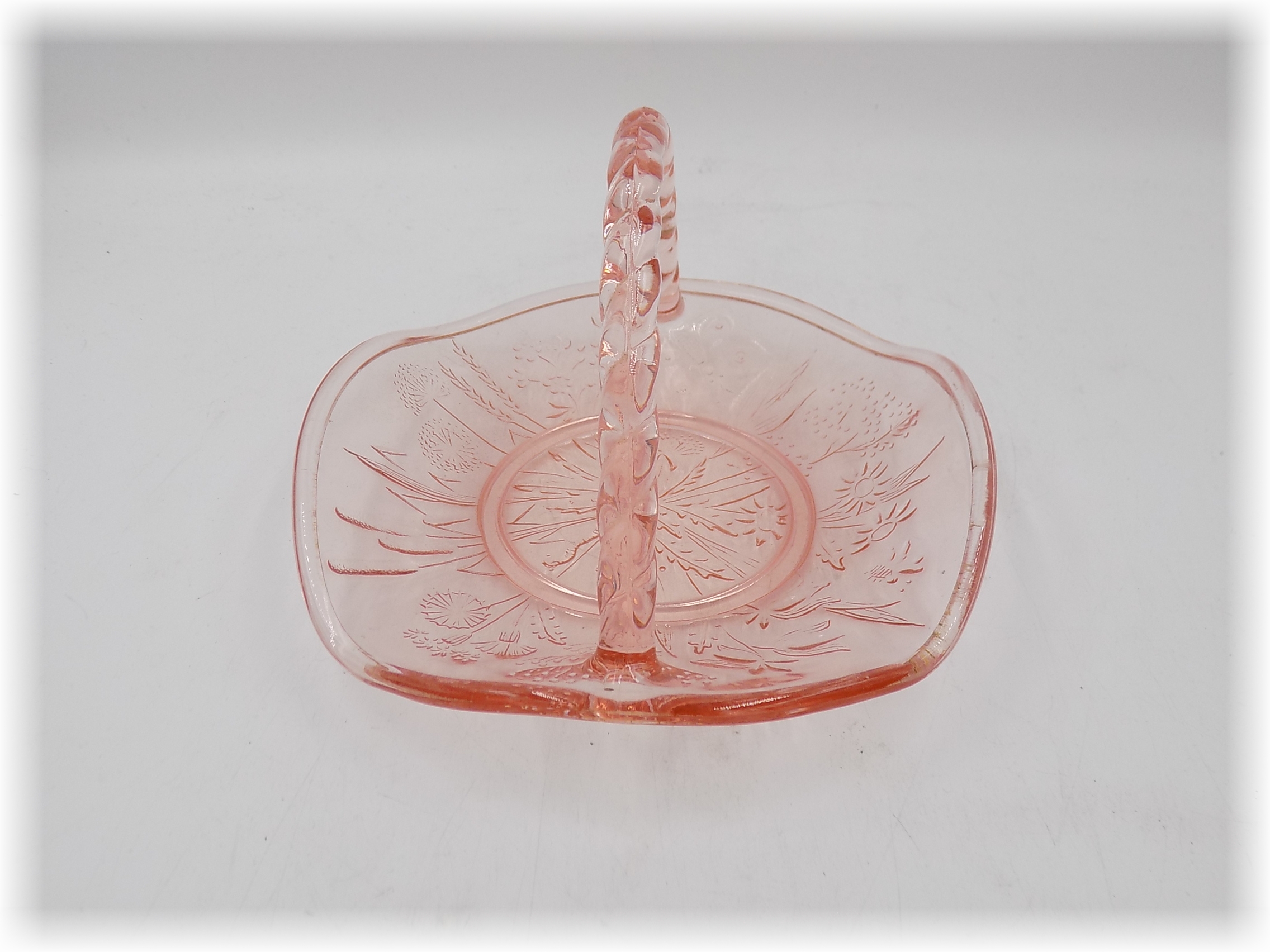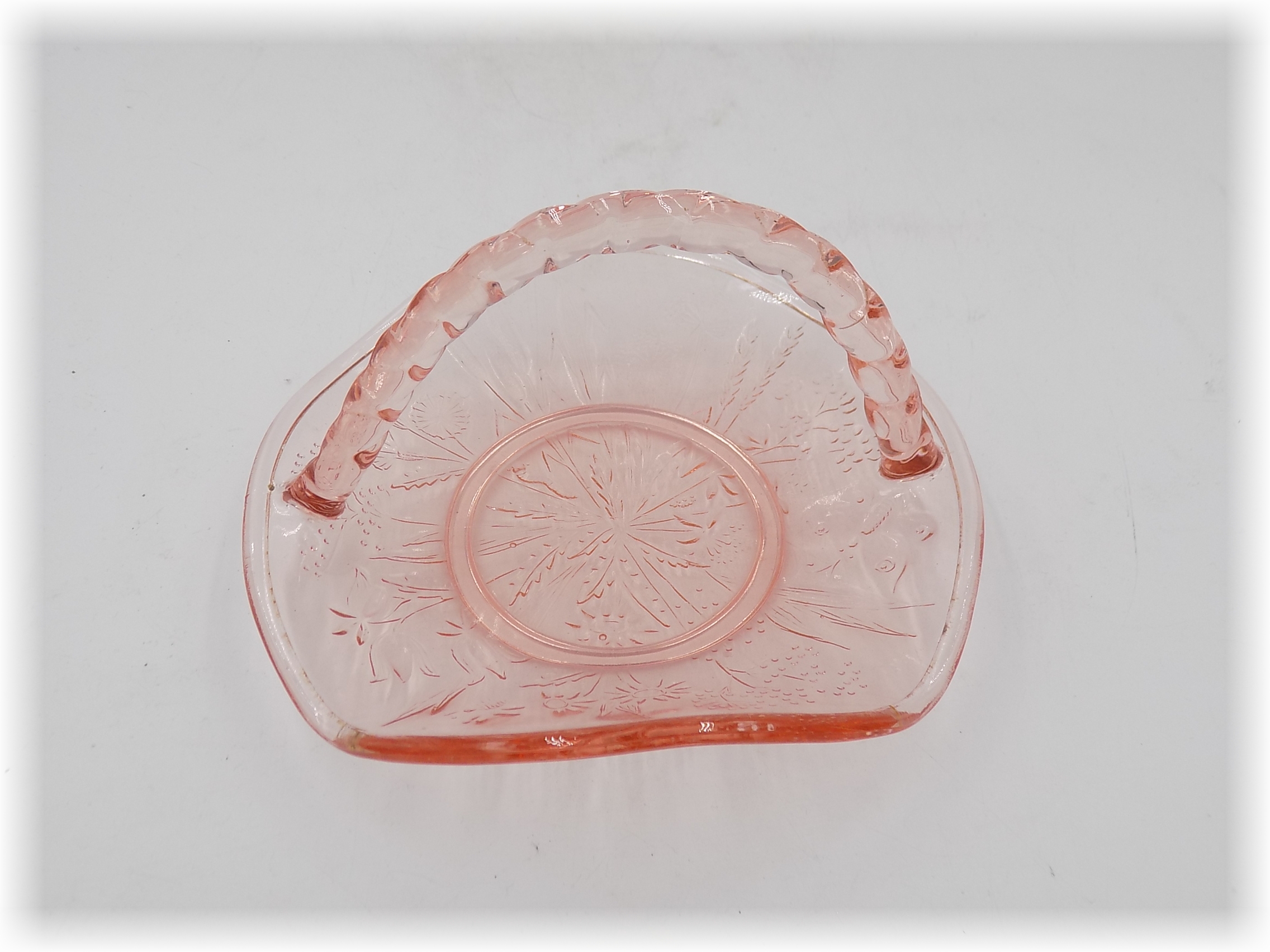 Łososiowy koszyk z HS Ząbkowice. Barwiony w masie. Projekt Eryka Trzewik-Drost. Pochodzi z lat 70-tych. Wymiary; wys.9 x 16,5 x 15,5 cm.