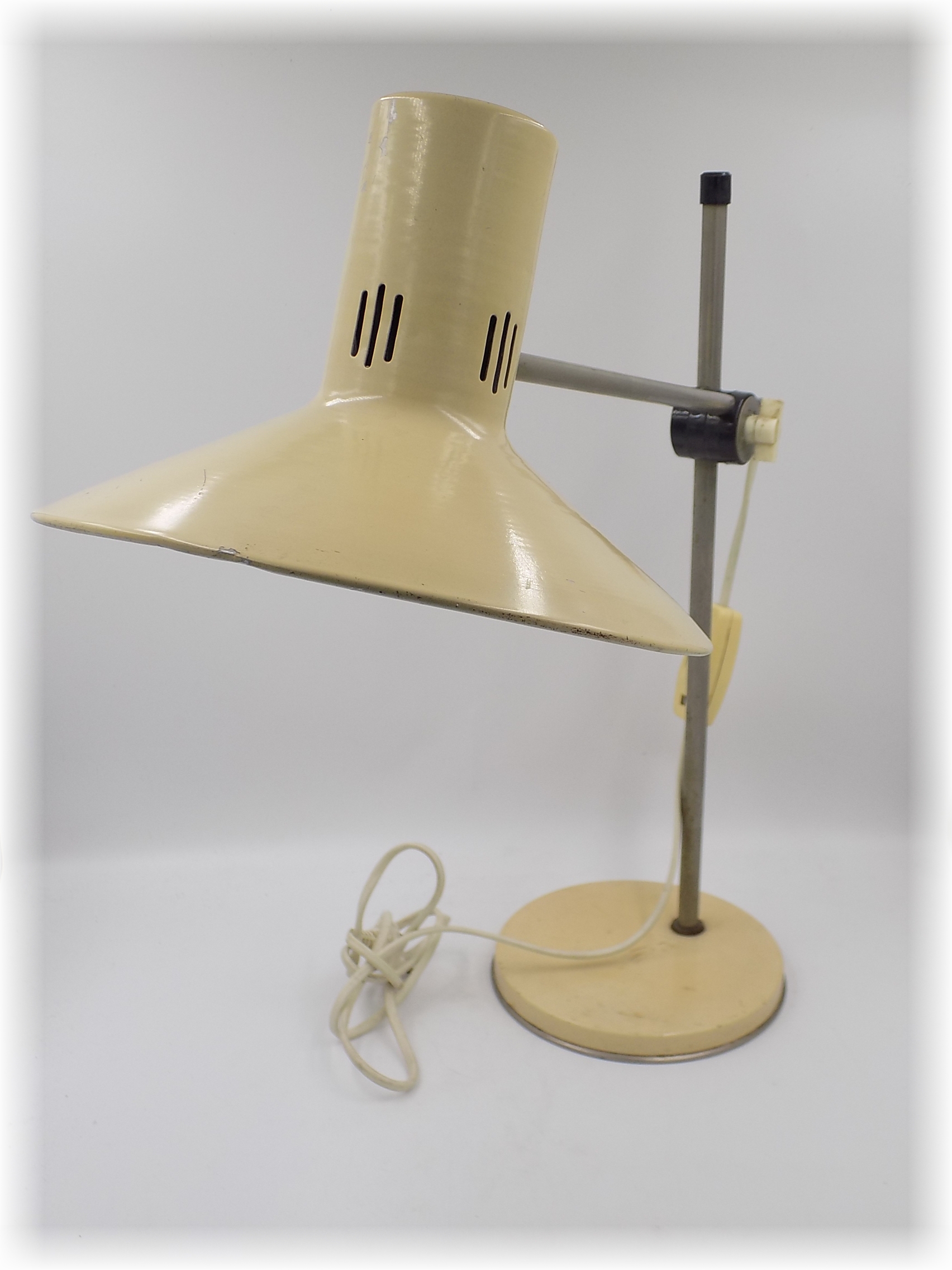 Lampa biurowa z Polam Wilkasy z lat 60/70-tych. Sygnowana. Sprawna. Wysokość regulowana. Wymiary;wys.46 x 47 x 16 cm.