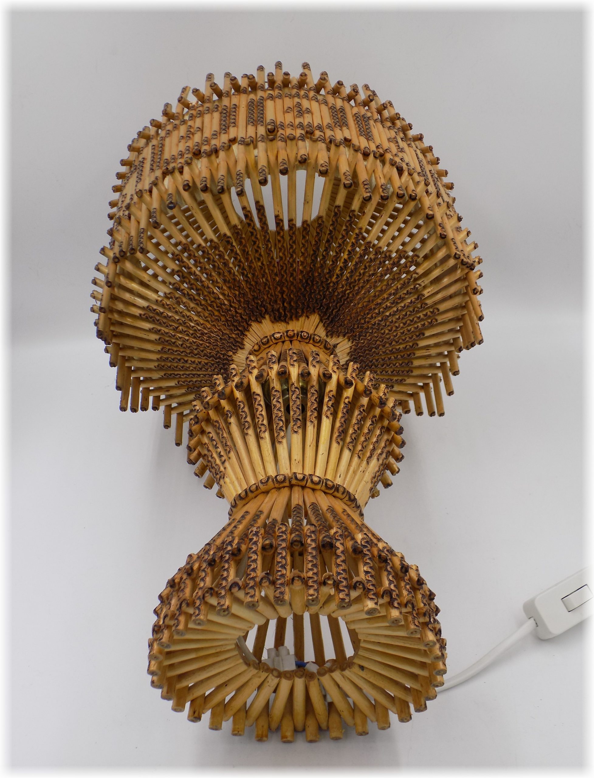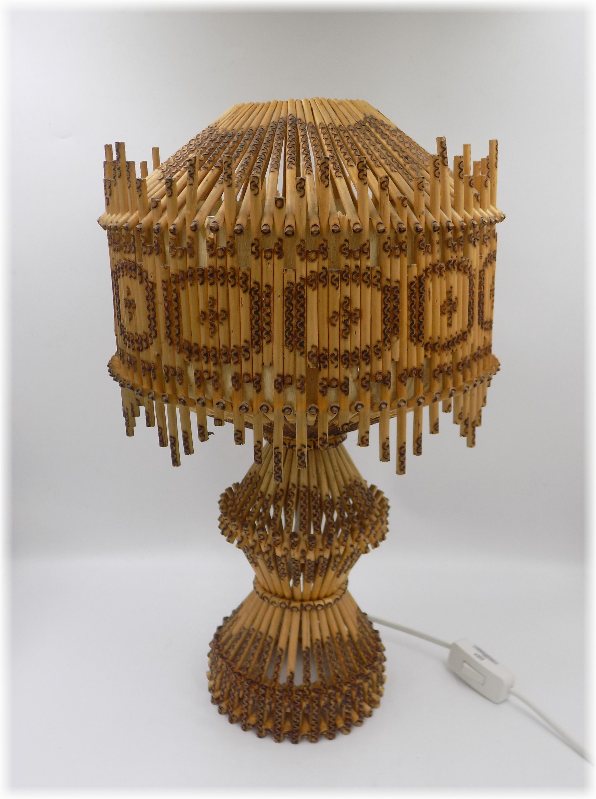 Ręcznie wykonana z patyczków lampka w okresie PRL. Sprawna. Przełącznik i wtyczka nowa. Wymiary; wys.42 x 25 cm.