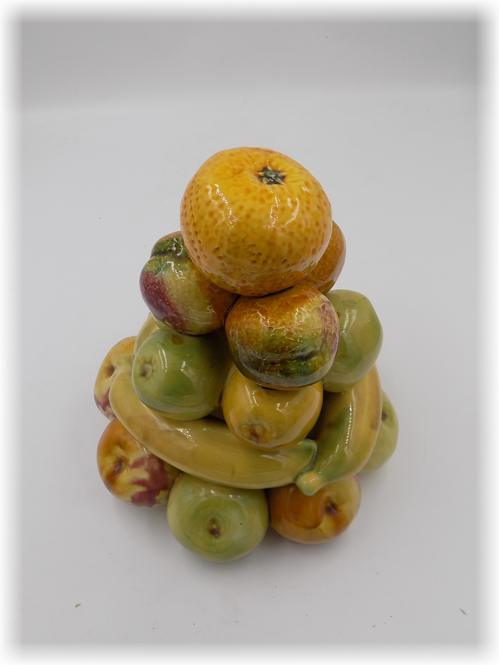 Majolikowa piramida z owoców z Portugalii z II poł.XX w. Sygnowana. Wymiary; wys.24 x 19 cm