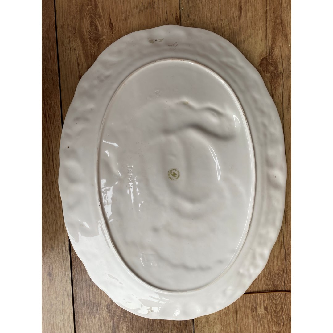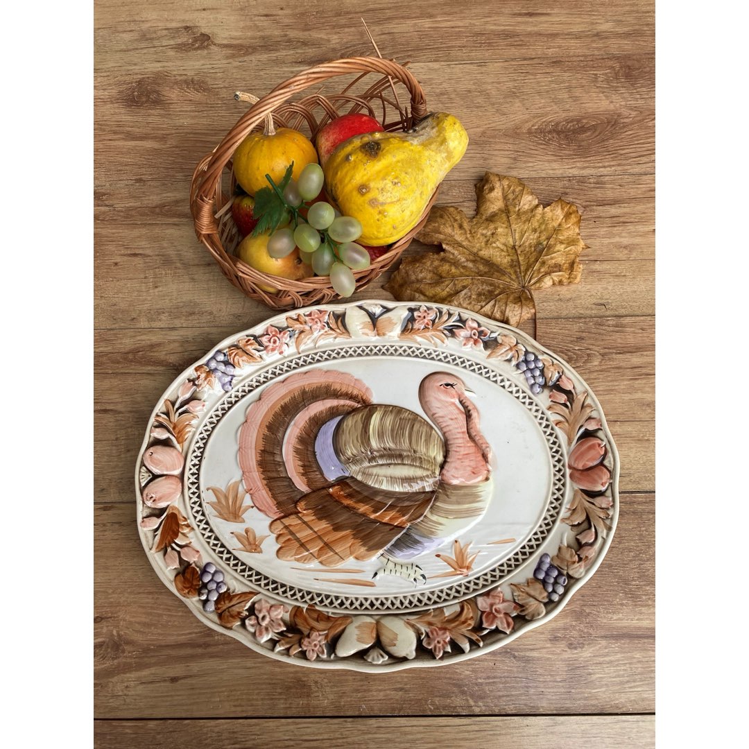 Majolikowy półmisek do drobiu z wizerunkiem indyka. Ceramika japońska potrafi zaskakiwać i tu mamy przykład nietuzinkowego przedmiotu który może zaczarować każdy stół. Prawdopodobnie pochodzi z lat 70-tych. Sygnowany. Wymiary; 48 x 37 cm.