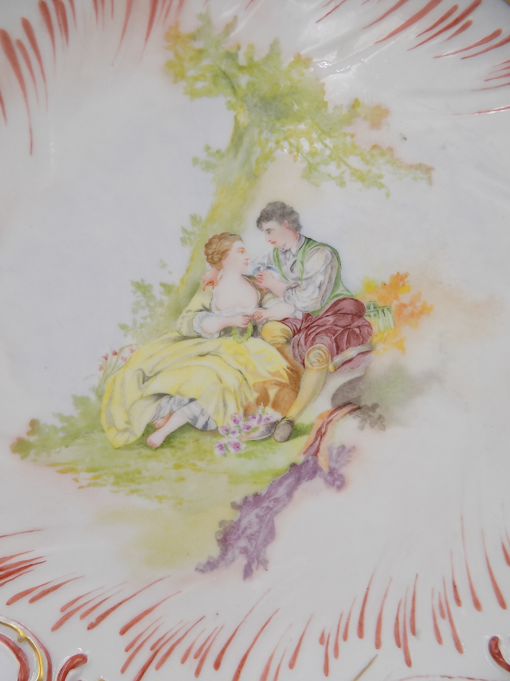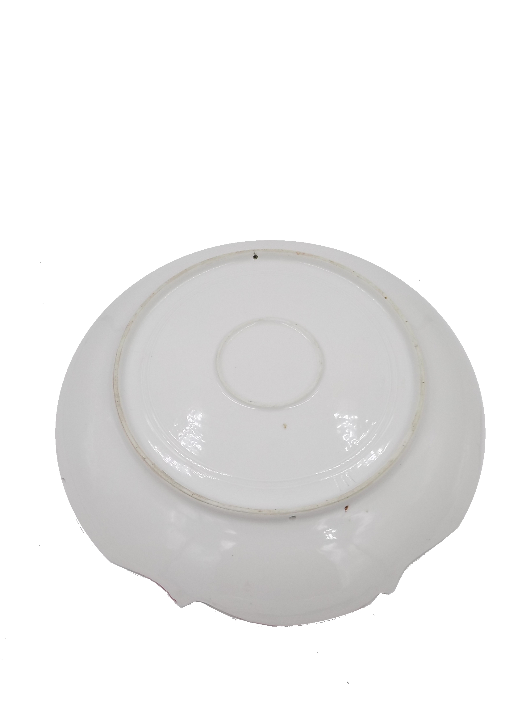 Porcelanowa patera dekoracyjna prawdopodobnie z jednej ze śląskich wytwórni porcelany z przełomu XIX i XX w. Sygnowana trzema wyciskanymi kreskami. Wymiary; 4 x 32 cm