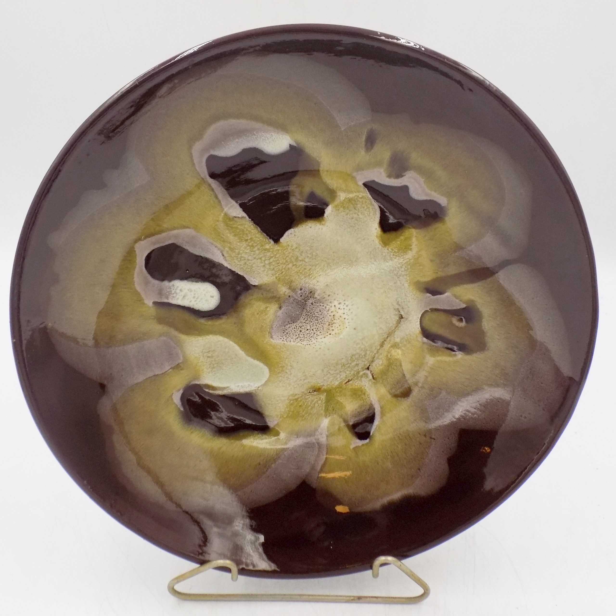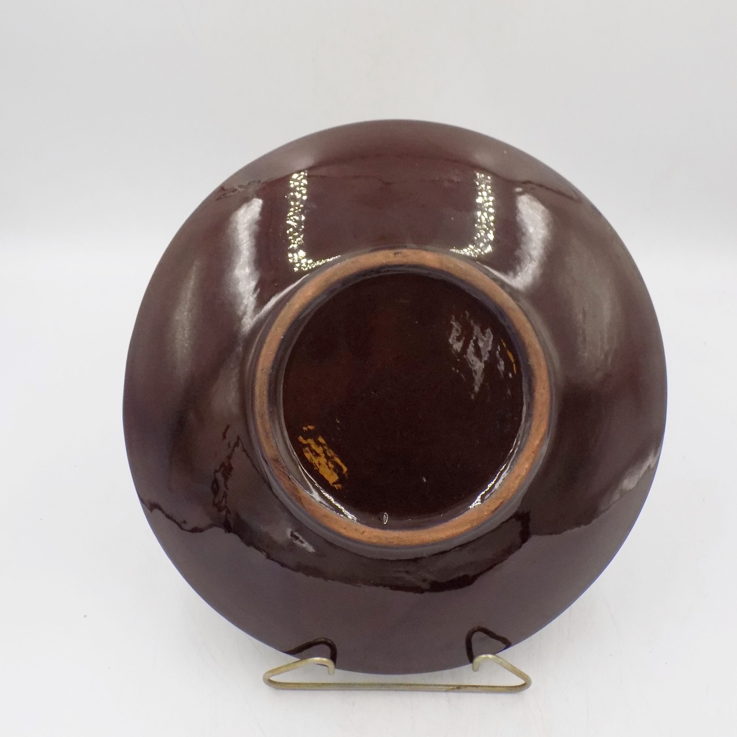 Patera z czerwonej glinki z nietuzinkową glazurą ze Spółdzielni Pracy Przyjaźń Włocławek. Wymiary; 4 x 26 cm.