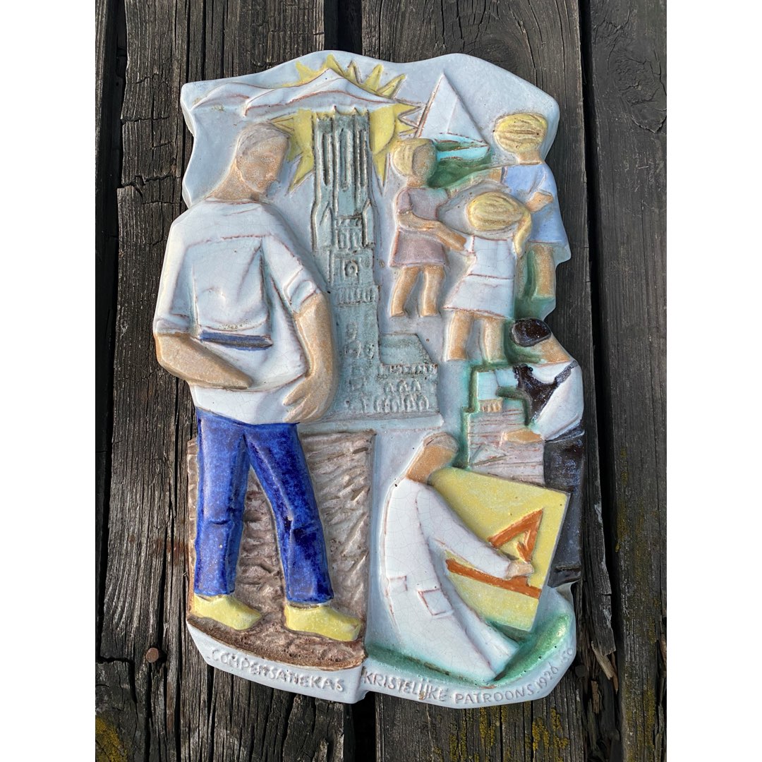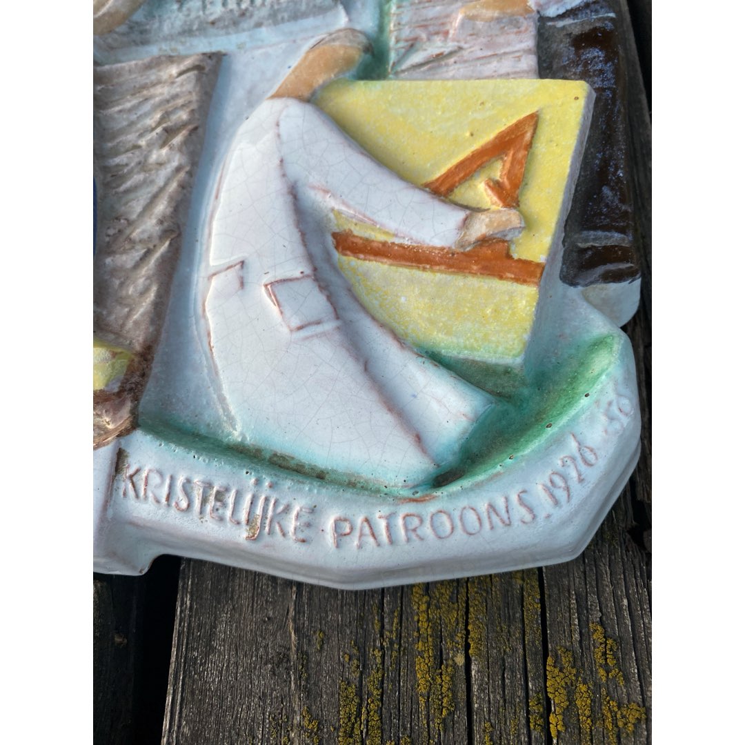 Okolicznościowa plakieta ceramiczna prawdopodobnie z 1959 roku. Glazurowana. Pochodzi prawdopodobnie z Izegem Belgia. Wymiary; wys.34 x 22 x 2,5 cm.