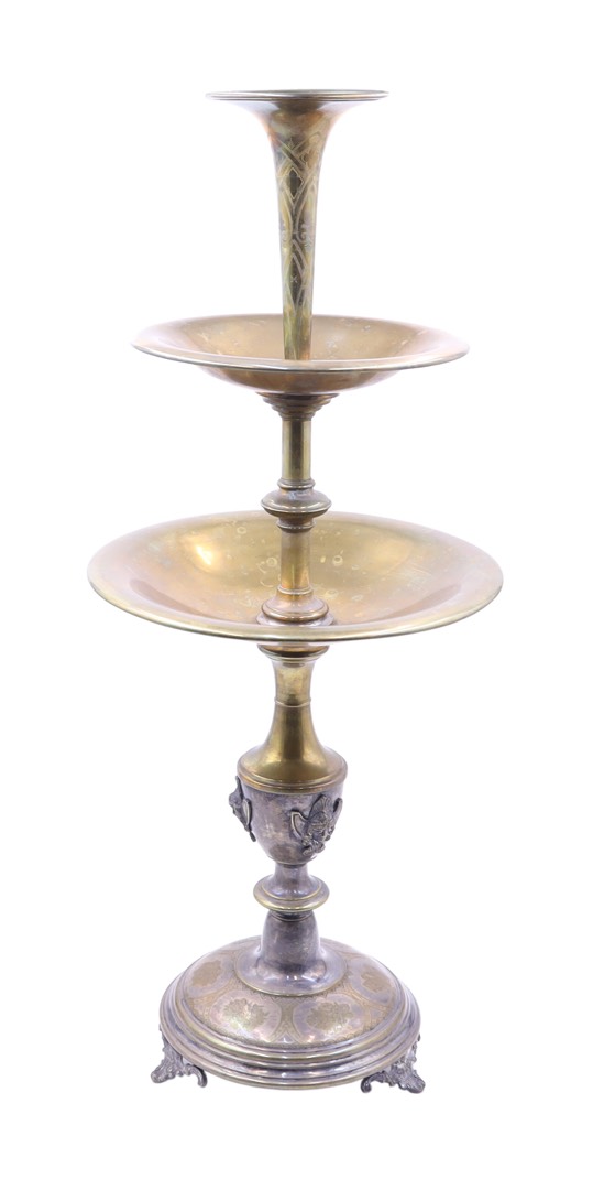 Zaawansowane zdobienia i detale ręcznie grawerowane na powierzchni karuzeli świadczą o finezji wykonania i dbałości o szczegóły charakterystycznej dla epoki, z której pochodzi. Gipsowy obciążnik w dolnej części zapewnia stabilność i równowagę, pozwalając na bezpieczne i eleganckie wyeksponowanie różnorodnych słodyczy, podkreślając ich wyjątkowy charakter.