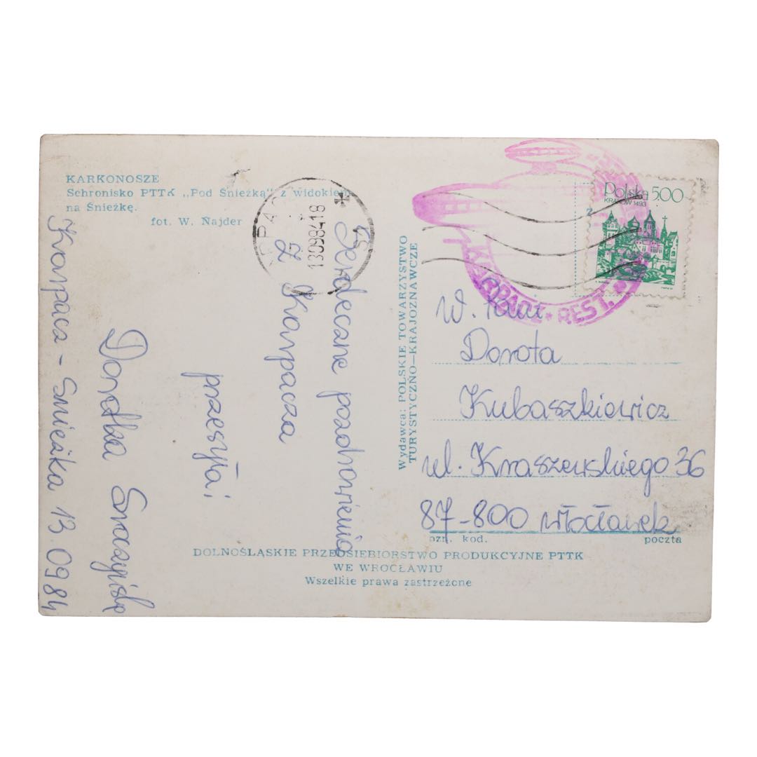 Zapraszamy do zakupu tej wyjątkowej pocztówki przedstawiającej Schronisko PTTK "Pod Śnieżką" w Karkonoszach za jedyne 25 zł. To wyjątkowa okazja, aby uzupełnić swoją kolekcję lub ozdobić przedmiot przesiąknięty historią i pięknem polskich gór. Zamów już dziś!