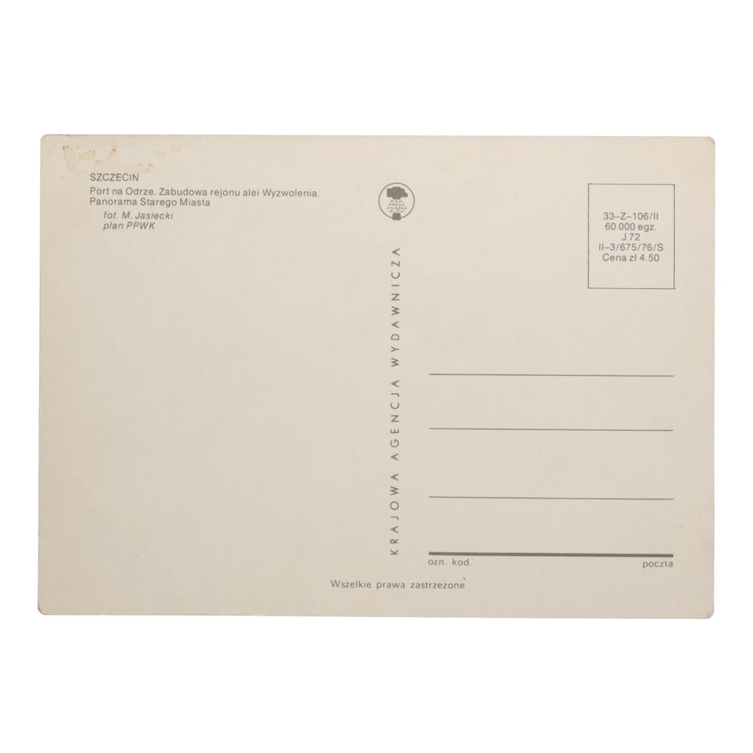 Odkryj kawałek historii Szczecina, uchwycony na tej wyjątkowej pocztówce. Prezentując malowniczy widok na port nad Odrą, aleję Wyzwolenia i panoramę starego miasta, ta pocztówka jest nie tylko świadectwem przeszłości, ale także wyjątkowym dziełem sztuki.
