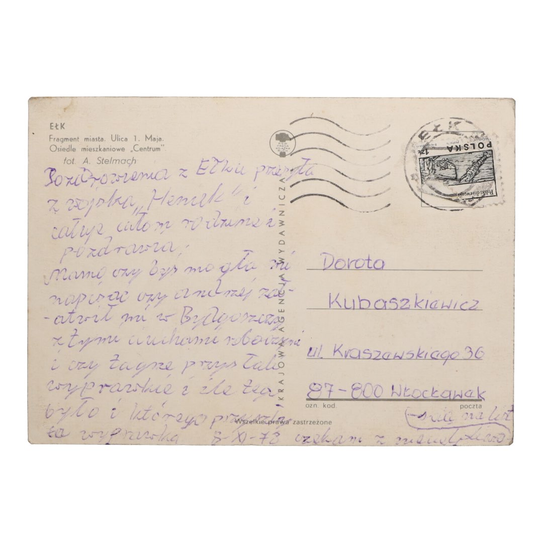 Pocztówka PRL Ełk z widokiem na fragment miasta, ulicę 1 Maja i osiedle "Centrum" to nie tylko kartka, to okno w przeszłość, które pozwala zanurzyć się w czasie. Cena wynosi tylko 25 zł, co czyni ją dostępną dla każdego, kto chce zachować kawałek historii.
