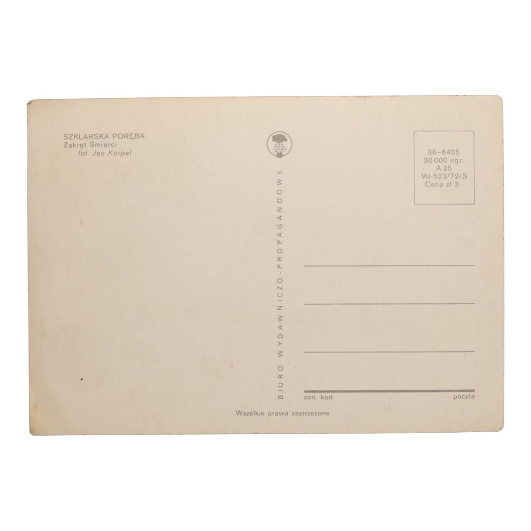 Pocztówka przedstawiająca słynny Zakręt Śmierci w Szklarskiej Porębie. To wyjątkowy przedmiot, który zachwyci każdego miłośnika historii i PRL-u.