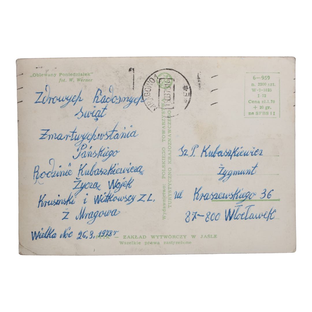 Zanurz się w nostalgicznej atmosferze polskich świąt wielkanocnych dzięki naszej wyjątkowej pocztówce świątecznej przedstawiającej Lany Poniedziałek z okresu PRL. Ta wyjątkowa pocztówka, która odtwarza sceny z tradycyjnych obchodów Lanego Poniedziałku, to idealny sposób na podzielenie się świąteczną radością z bliskimi.