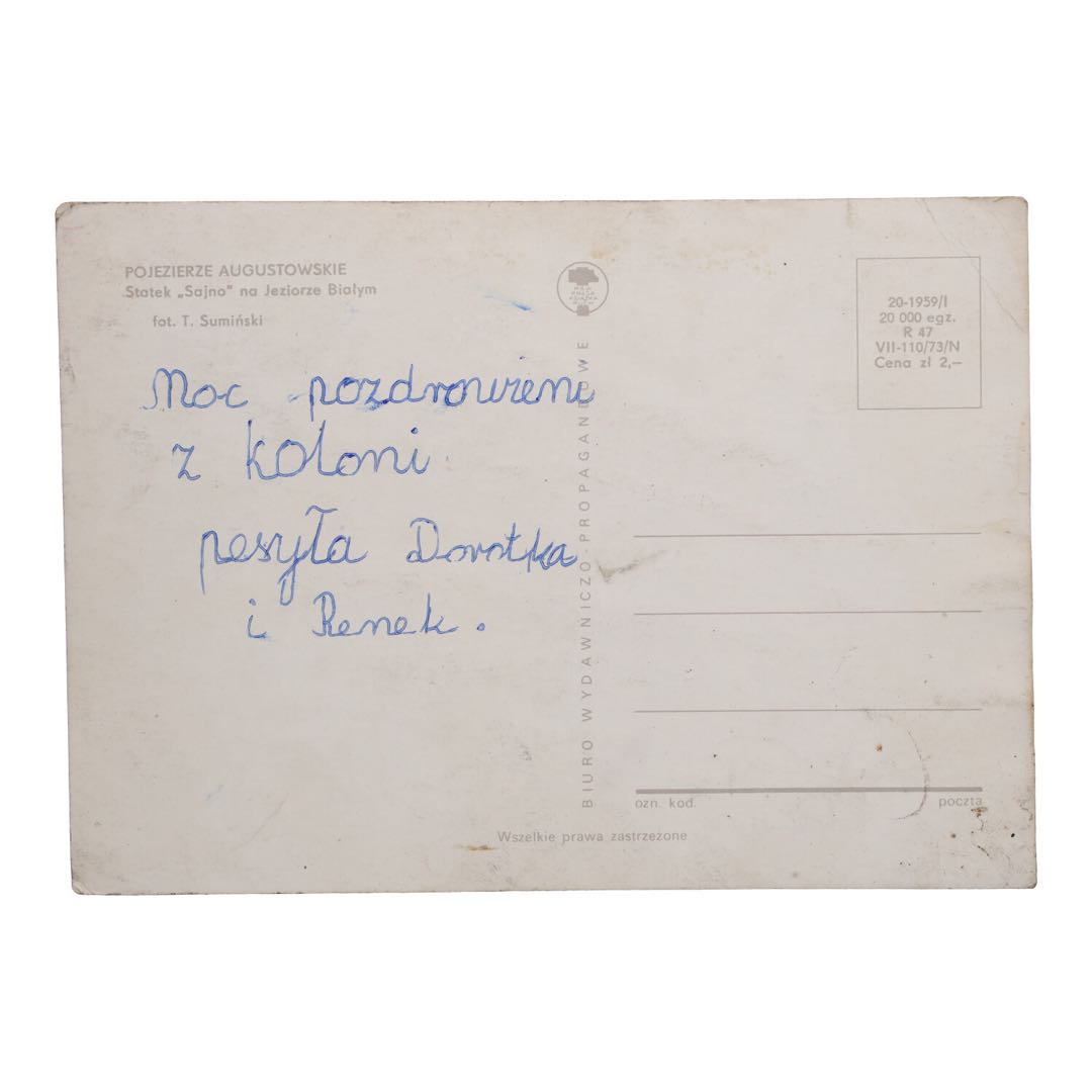 Odkryj urok minionych lat z naszą pocztówką przedstawiającą statek "Sajno" płynący majestatycznie po krystalicznie czystych wodach Jeziora Białego. Ta wyjątkowa pocztówka o wymiarach 15 x 10,5 cm to prawdziwy skarb dla kolekcjonerów i miłośników antyków.
