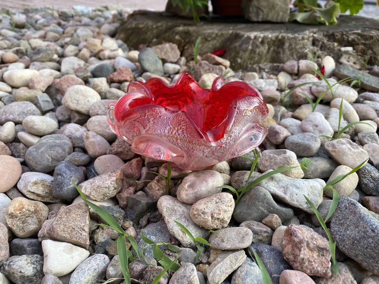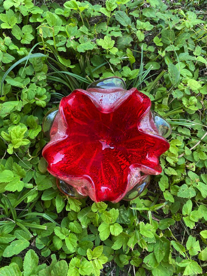 Piękna popielnica prawdopodobnie z Murano z lat 60/70-tych. Na jednej z krawędzi nieduża szczerba. Wymiary; wys. 6 x 12,5 cm.
