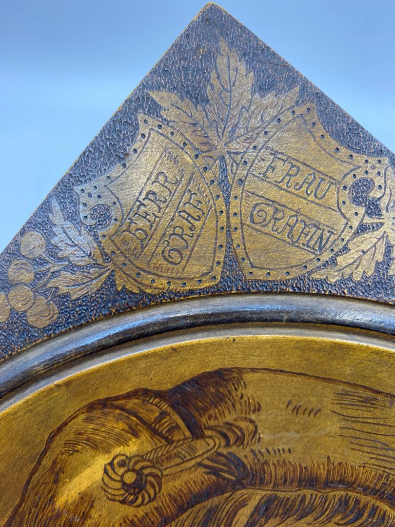 Ręcznie wykonana praca wykonana techniką rytowania w drewnie przedstawiająca panią Gryfin z 1898 roku. Wymiary; 25 x 26 cm.