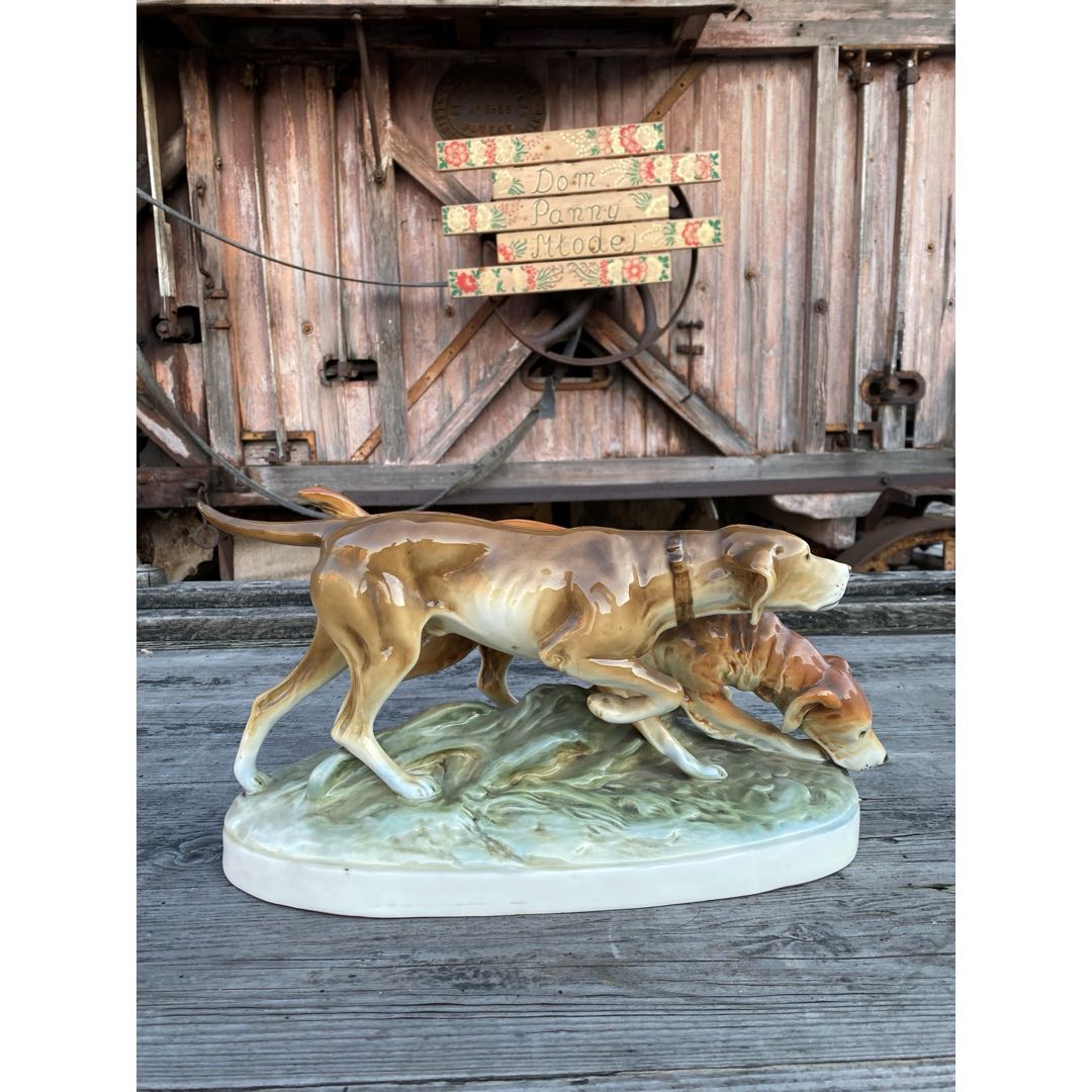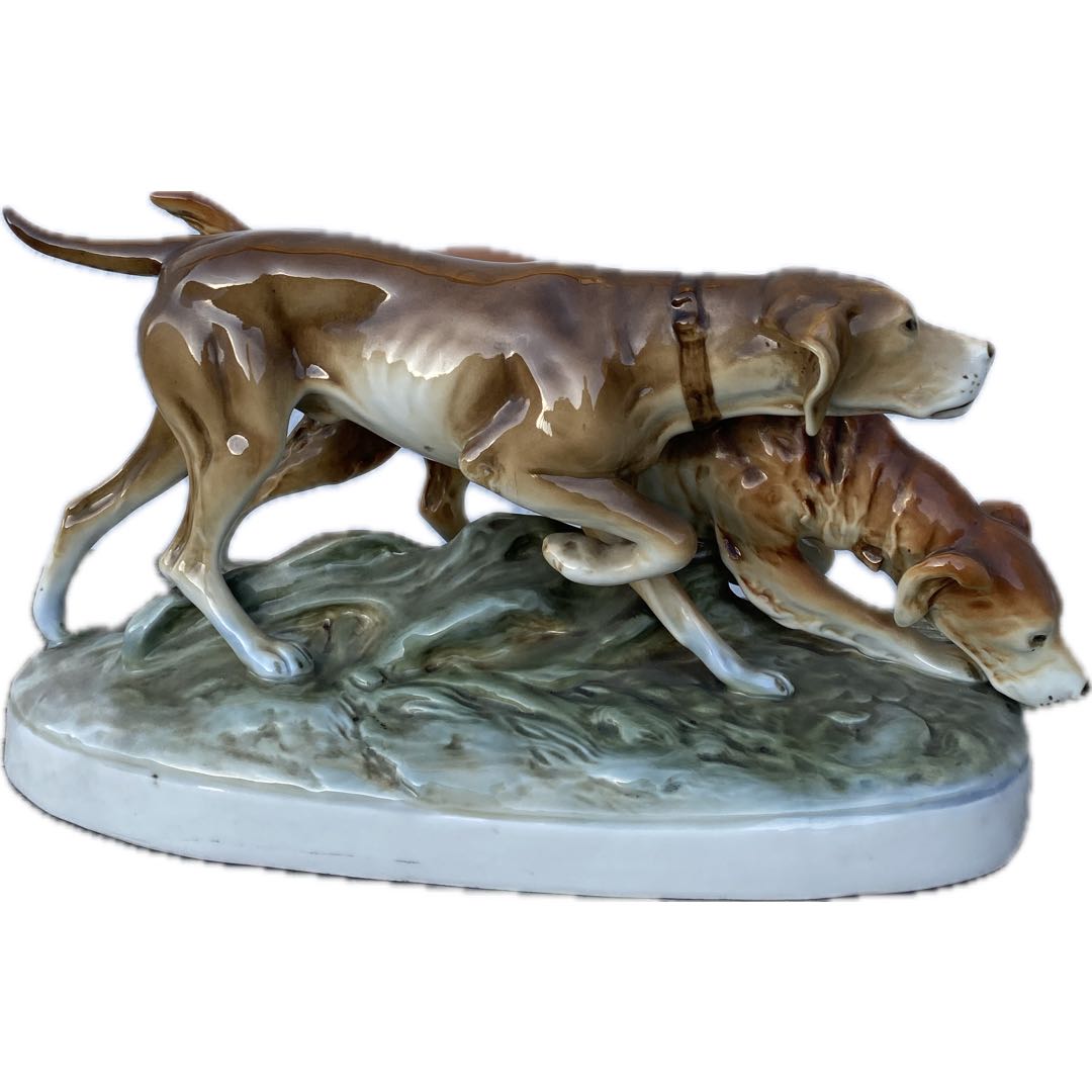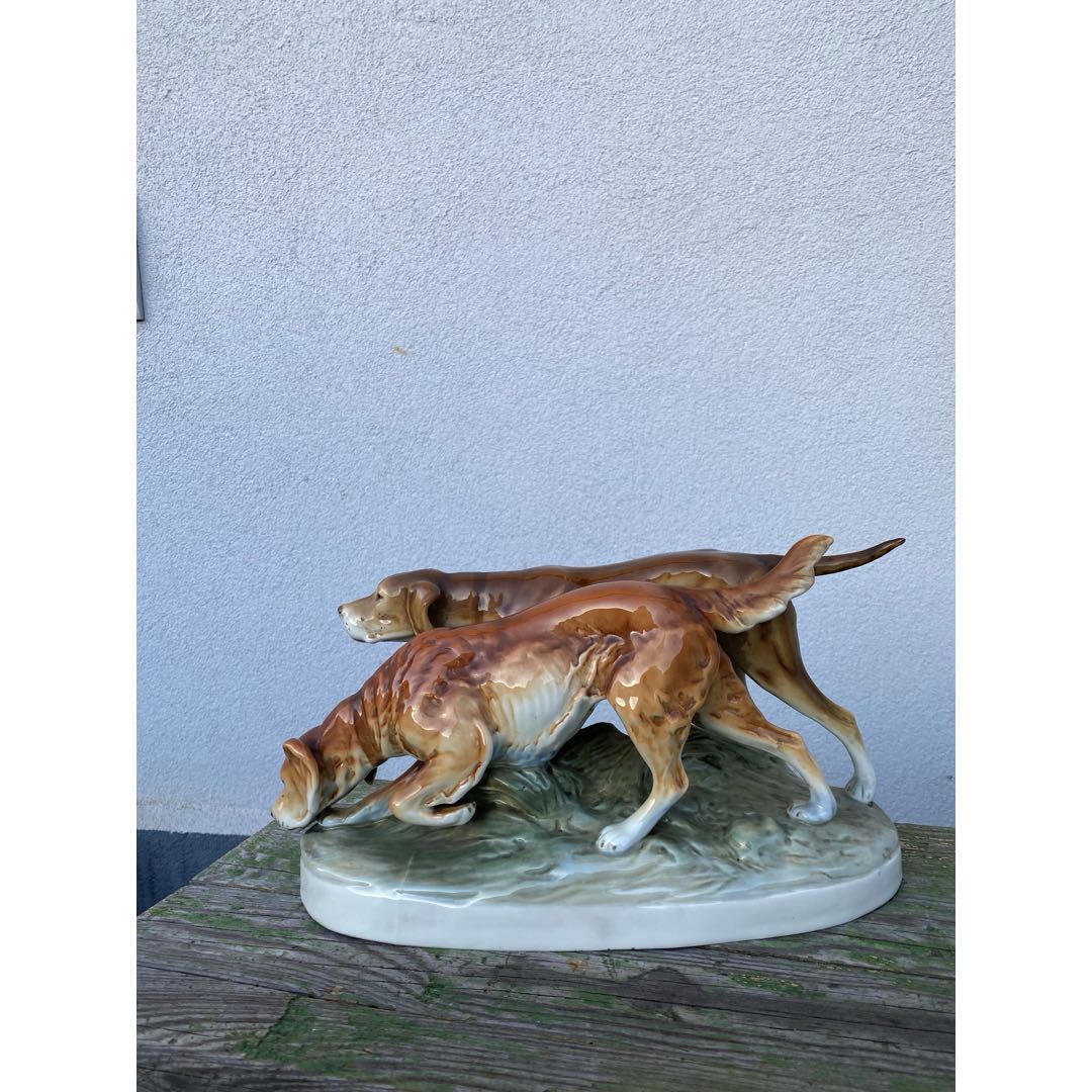 Duża porcelanowa figura przedstawiająca dwa psy myśliwskie z cenionej wytwórni Royal Dux. Sygnowana numerem wzoru „304” z roku 1933. Przedstawiona figura jest świadectwem wysokiego kunsztu tej wytwórni porcelany i ceniona przez kolekcjonerów. Drobne ślady użytkowania. Wymiary; wys.19 x 38 x 15 cm.
