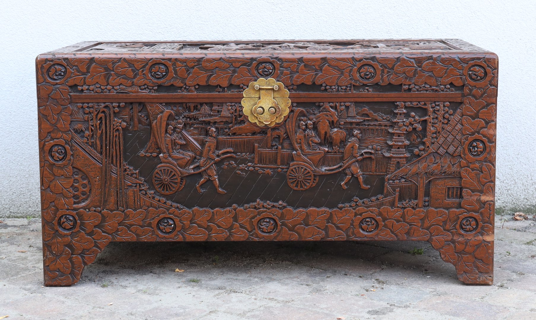 Dzięki misternym płaskorzeźbom z chińską tematyką, ta skrzynia staje się nie tylko meblem, ale także niezwykłym elementem dekoracyjnym. Doskonale wpisuje się w różnorodne style wnętrz, dodając im unikalnego charakteru i wyrafinowanego uroku.