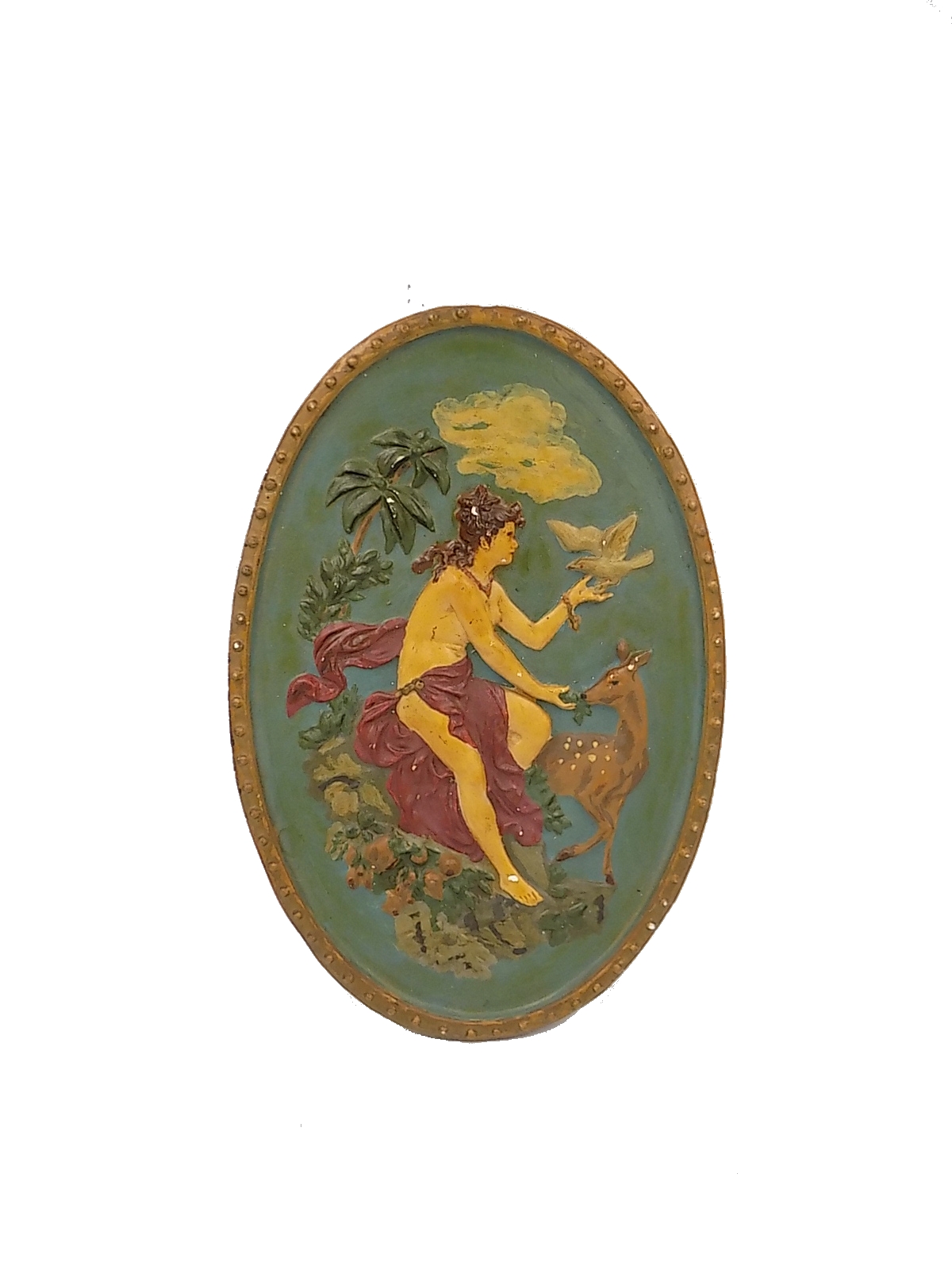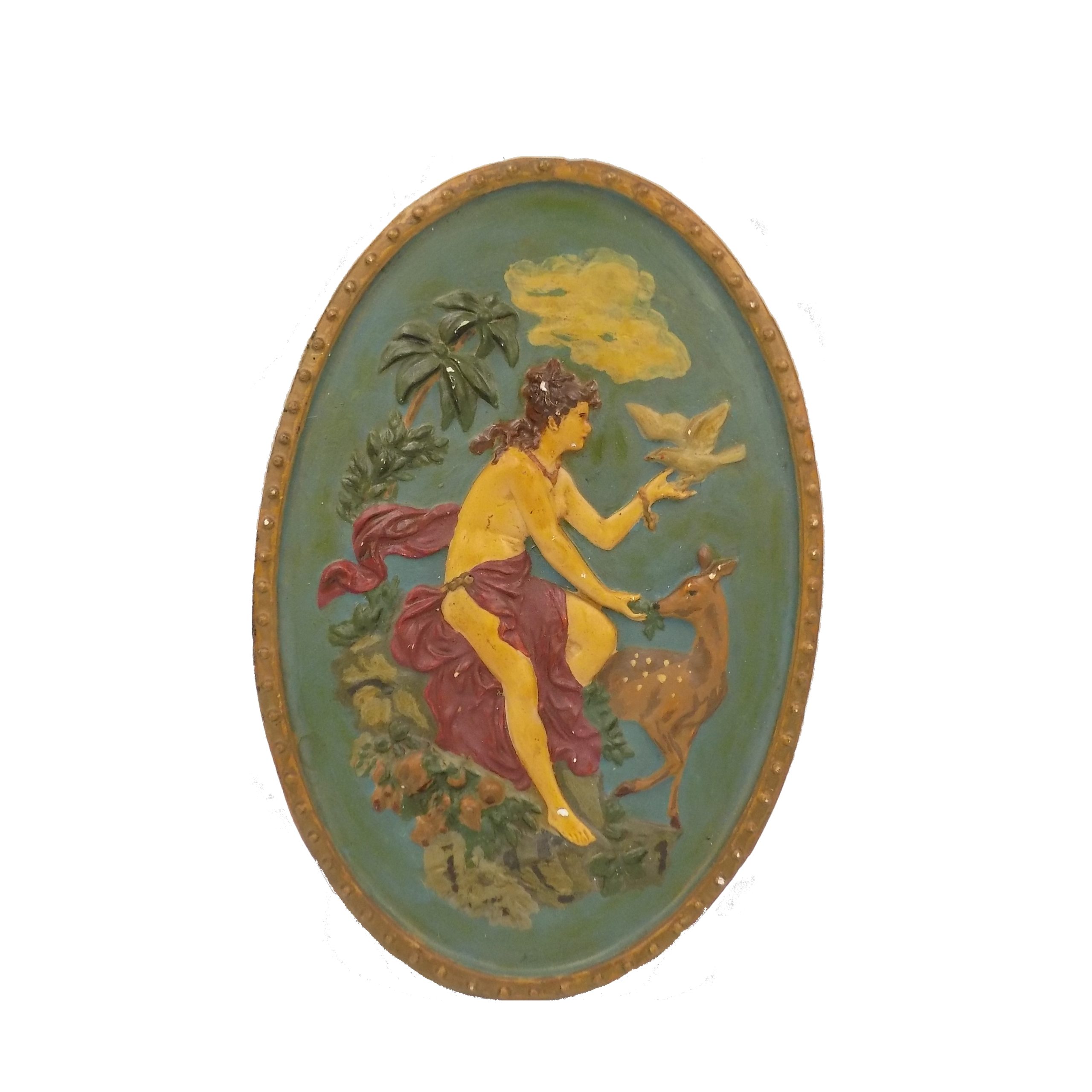 Zabytkowa plakieta dekoracyjna z gipsu z I poł.XX w. nawiązująca trochę do słynnej Diany z Wersalu. Wymiary; 37,5 x 25 cm.