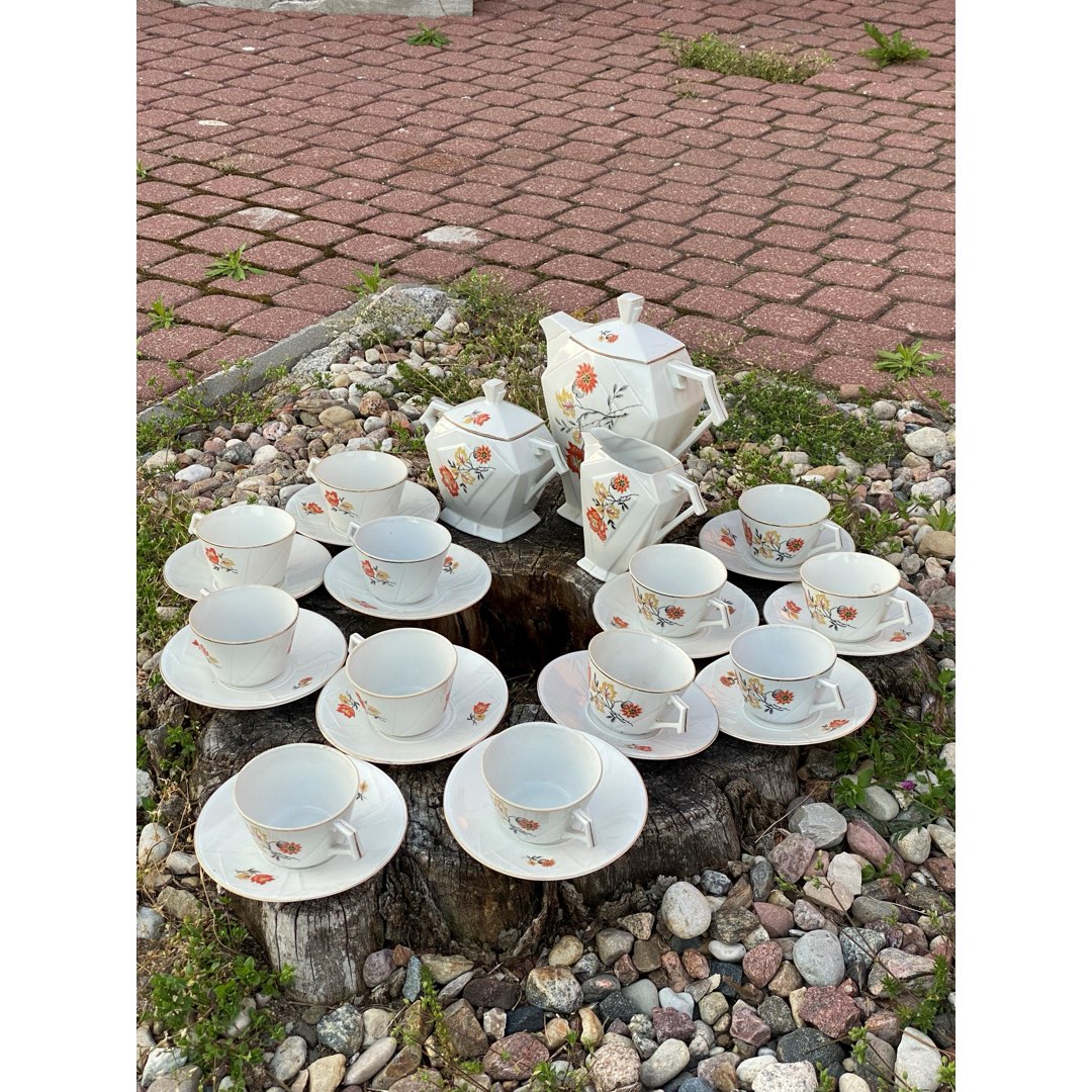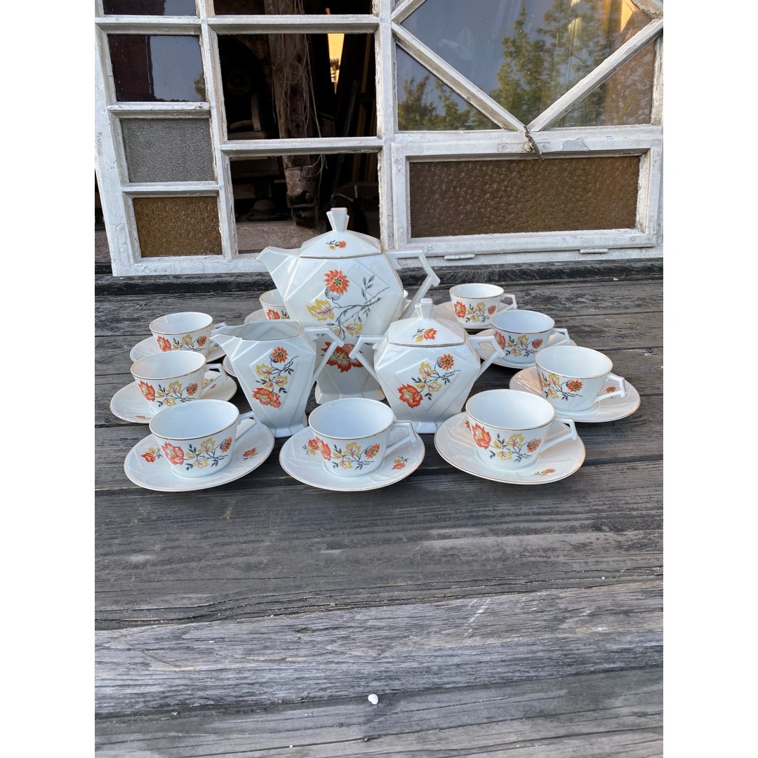Porcelanowy serwis kawowy na 12 osób w stylu Art. Deco z lat 30-tych. Prawdopodobnie pochodzi z wytwórni porcelany Bloch & Co Eichwald. Sygnowany wyciskanymi numerami. Wymiary; dzbanek, 22 cm, cukiernica 14 cm, mlecznik 12 cm, talerzyk 14,5 cm, filiżanki wys.5,5 x 8,5 cm.