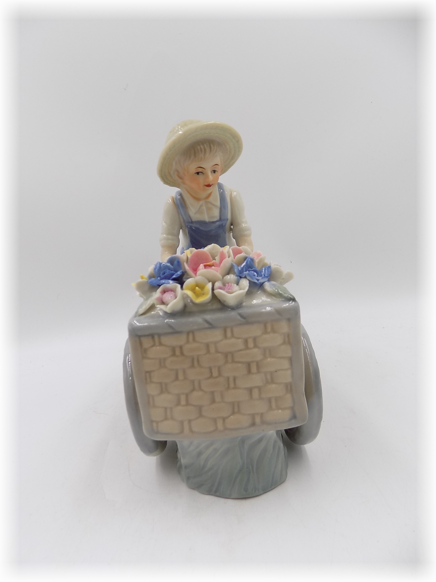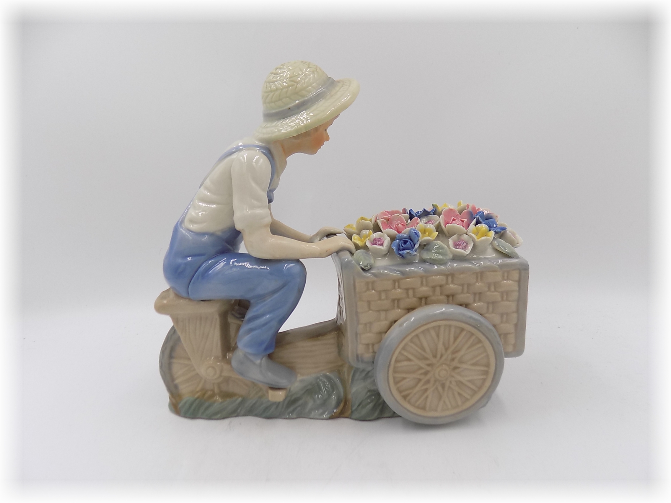 Porcelanowa figura przedstawiająca chłopca na rowerze z koszem kwiatów. Figura prawdopodobnie z II poł.XX w. Wymiary; wys.18 x 19 x 8 cm.