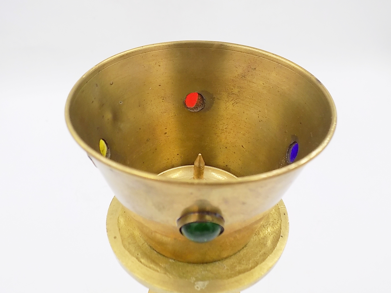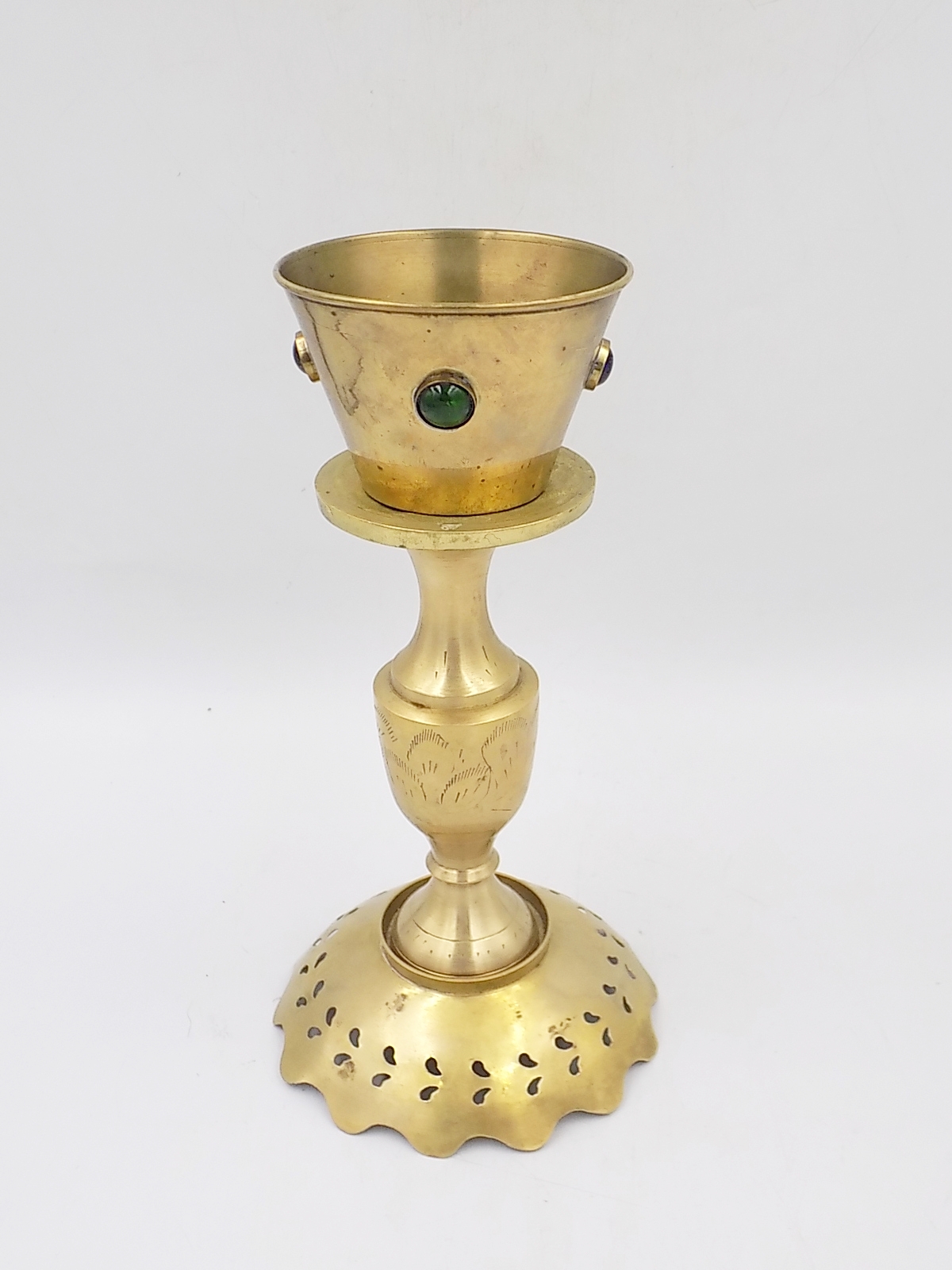 Stary świecznik z mosiądzu wysadzany kolorowymi szkiełkami z II poł.XX w. Wymiary; wys.24 x 12 cm