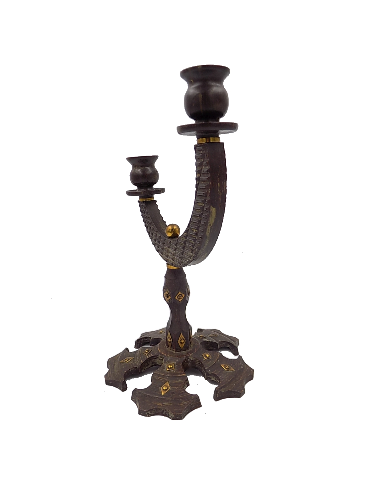 Stary, drewniany świecznik w stylu Art Deco. Wymiary; wys.31 x 21 x 18 cm