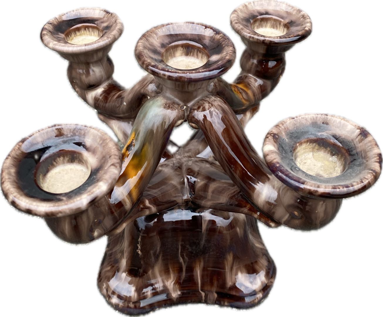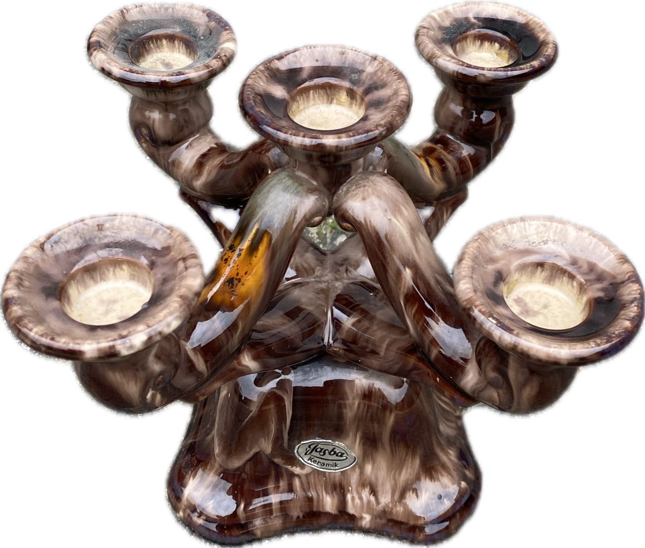 Ceramiczny świecznik na 5 świec cudownie glazurowany w stylu Art. Deco. Pochodzi Prawdopodobnie z lat 60-tych. Sygnowany. Oryginalna etykieta. Wymiary; wys.18 x 23 x 18 cm.
