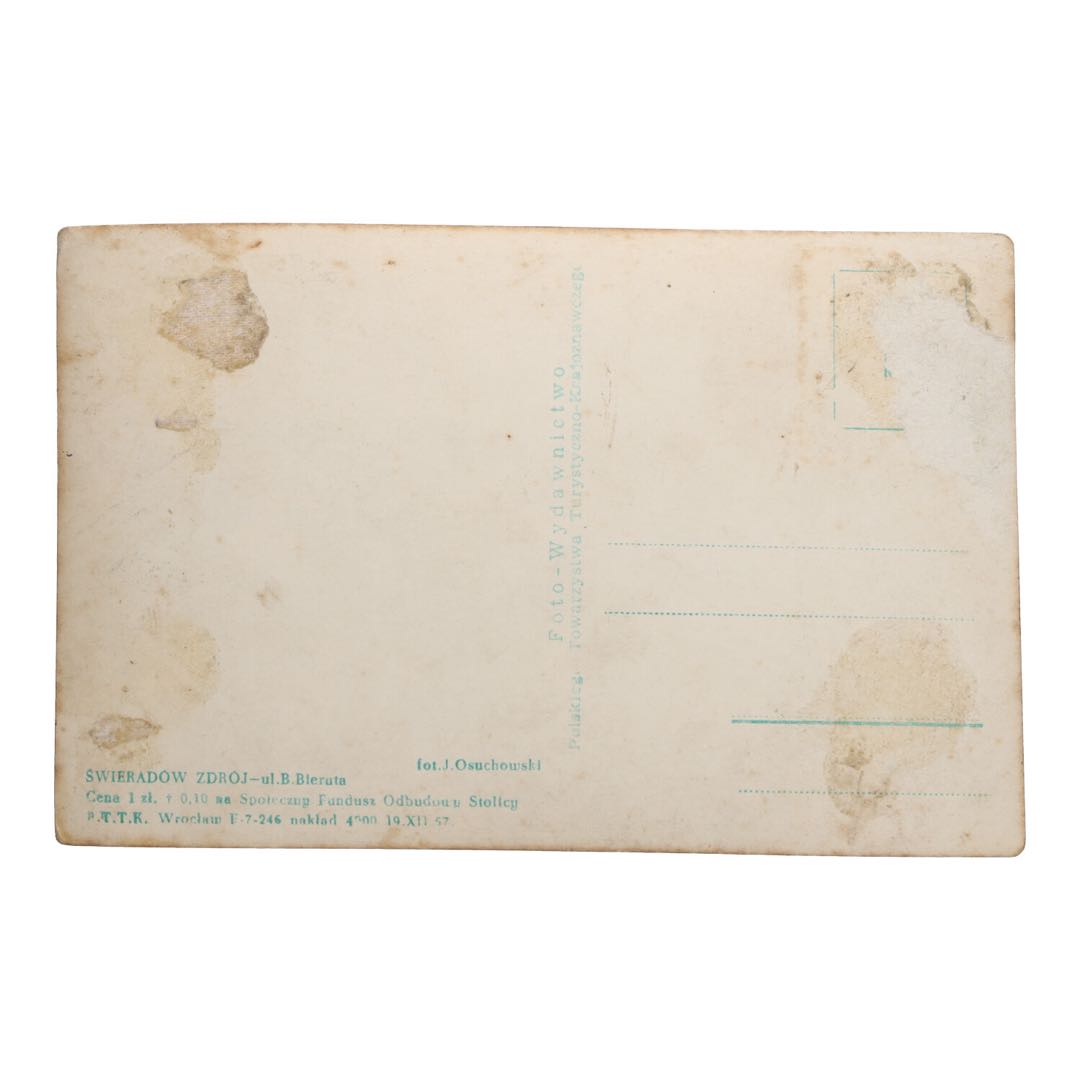 Cofnij się w czasie z wyjątkową pocztówką ze Świeradowa Zdroju, pochodzącą z czasów PRL. Mierząca 9 x 14 cm pocztówka za 25 zł to nie tylko piękny kawałek historii, ale także wyjątkowa dekoracja, która doda charakteru każdemu wnętrzu.