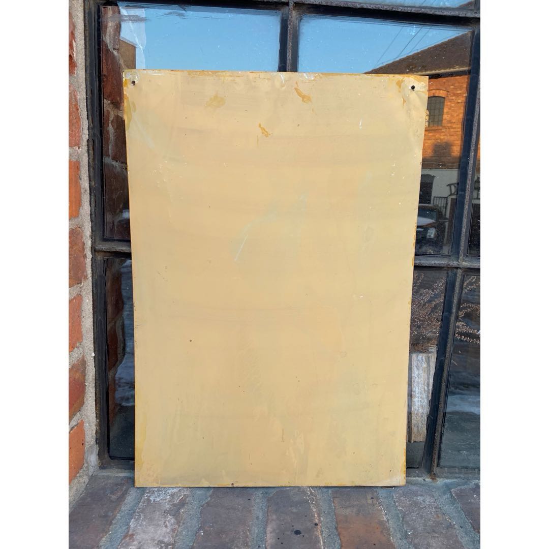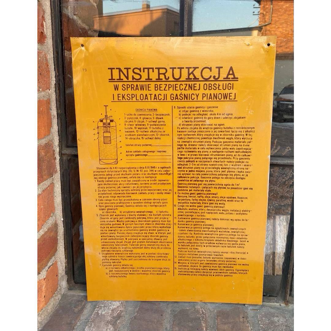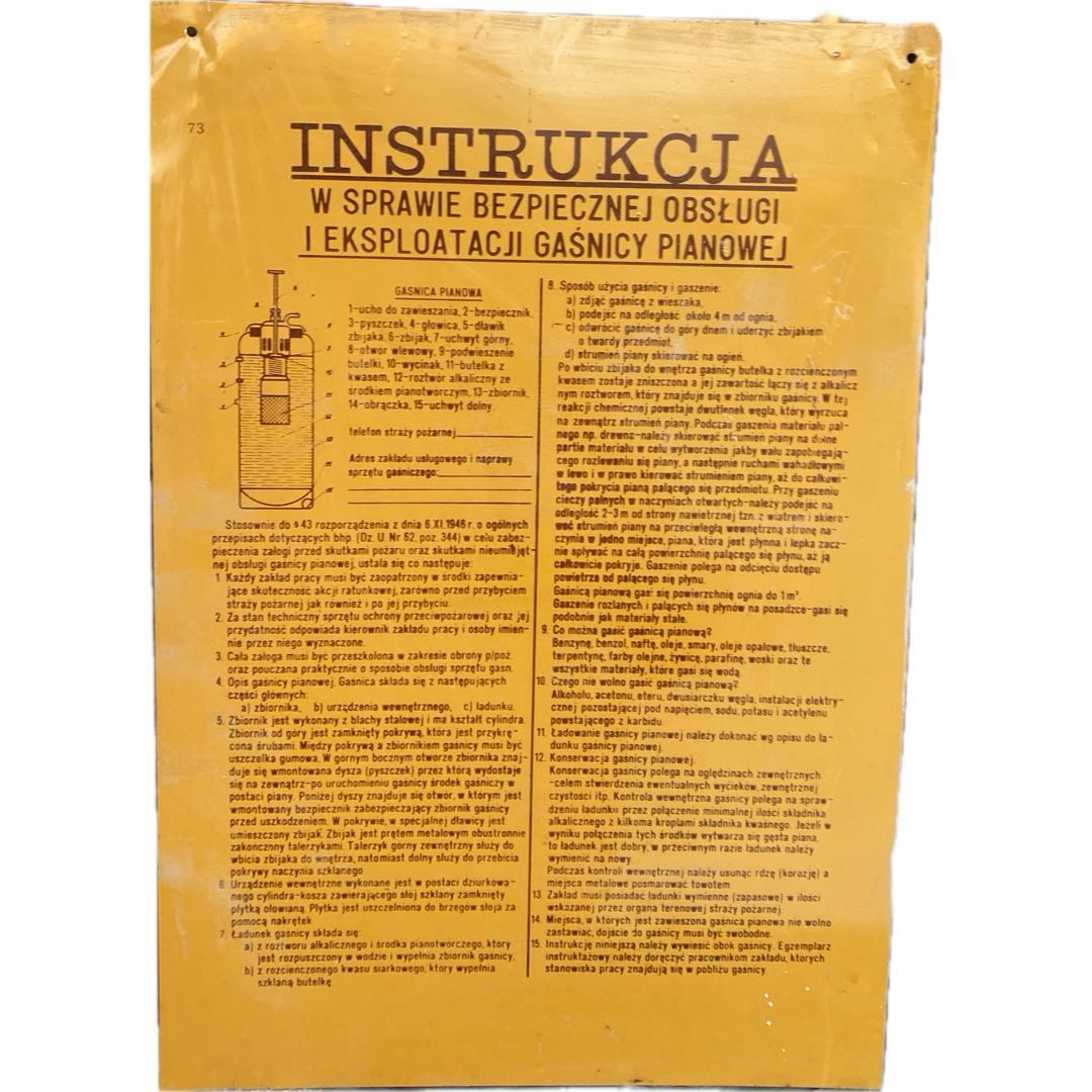 Tablica informacyjna „Instrukcja w sprawie bezpiecznej obsługi i eksploatacji gaśnicy pianowej" na blasze z okresu PRL. Wymiary; wys. 51 x 35 cm.