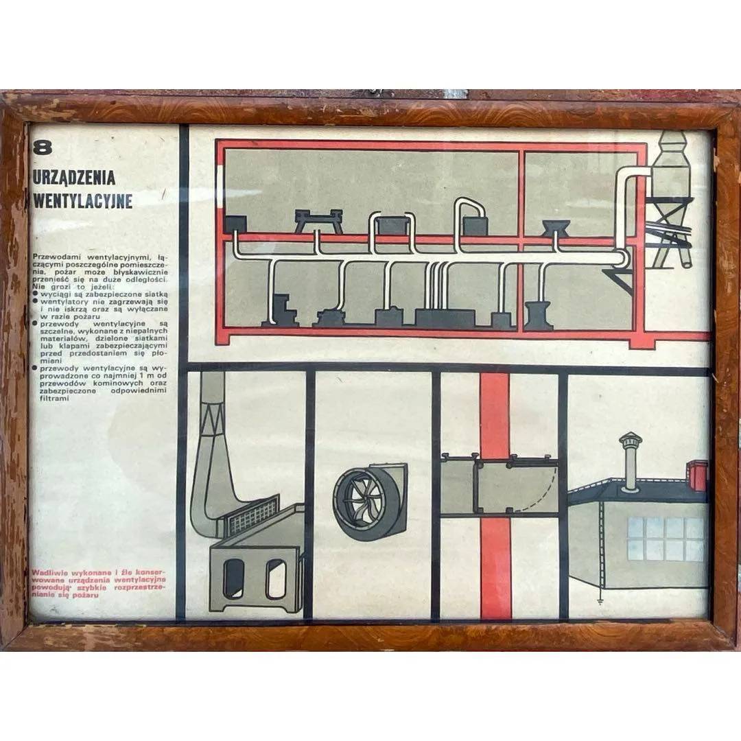 Tablica informacyjna „Urządzenia wentylacyjne" na kartonie za szybką oprawiona w ramkę z okresu PRL. Wymiary; wys. 30 x 40 cm.