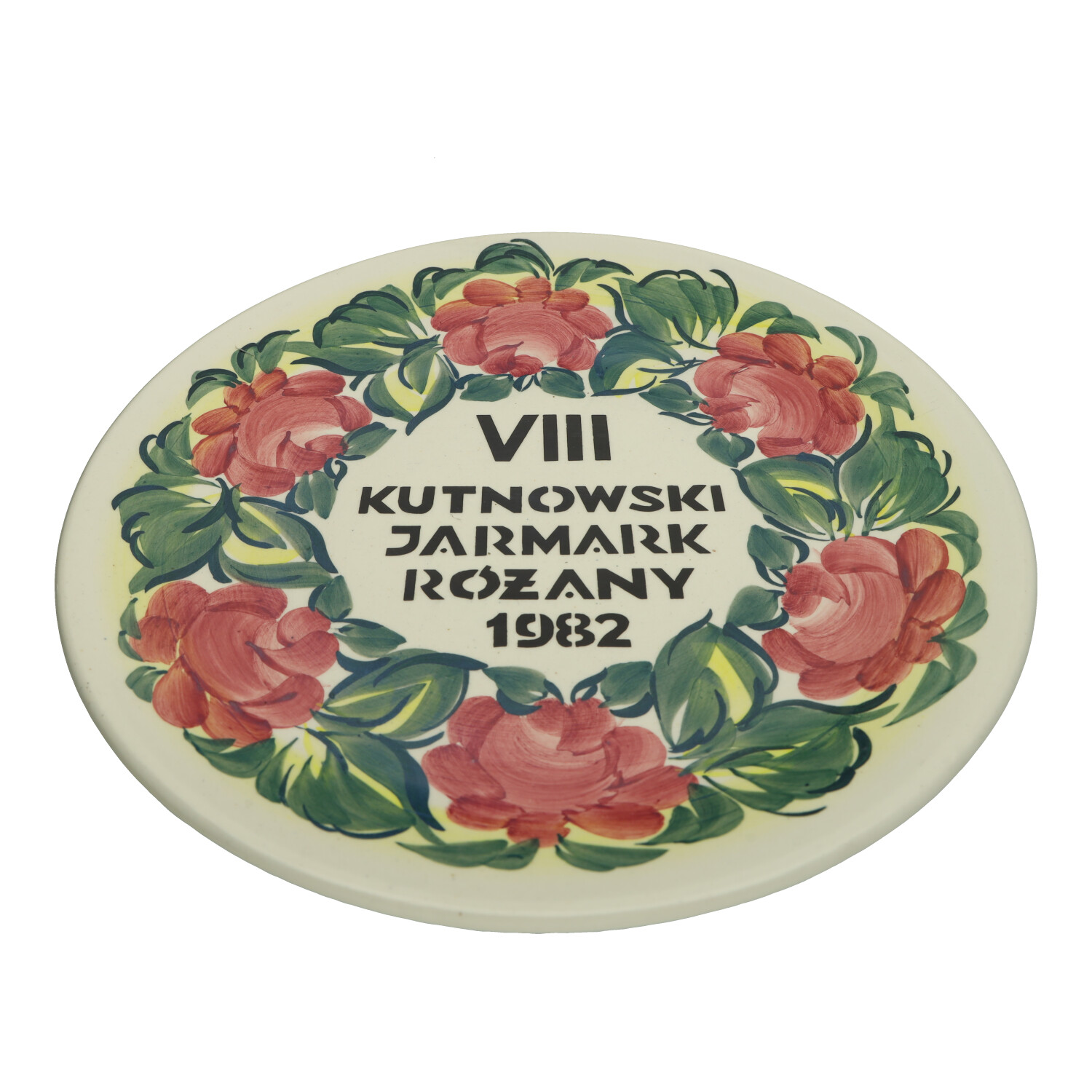 Fajansowy talerz okolicznościowy z ZF Koło, upamiętniający VIII Kutnowski Jarmark Różany, który odbył się w 1982 r. Sygnowany. Ręcznie malowany. Wymiary; 24 cm. /O.