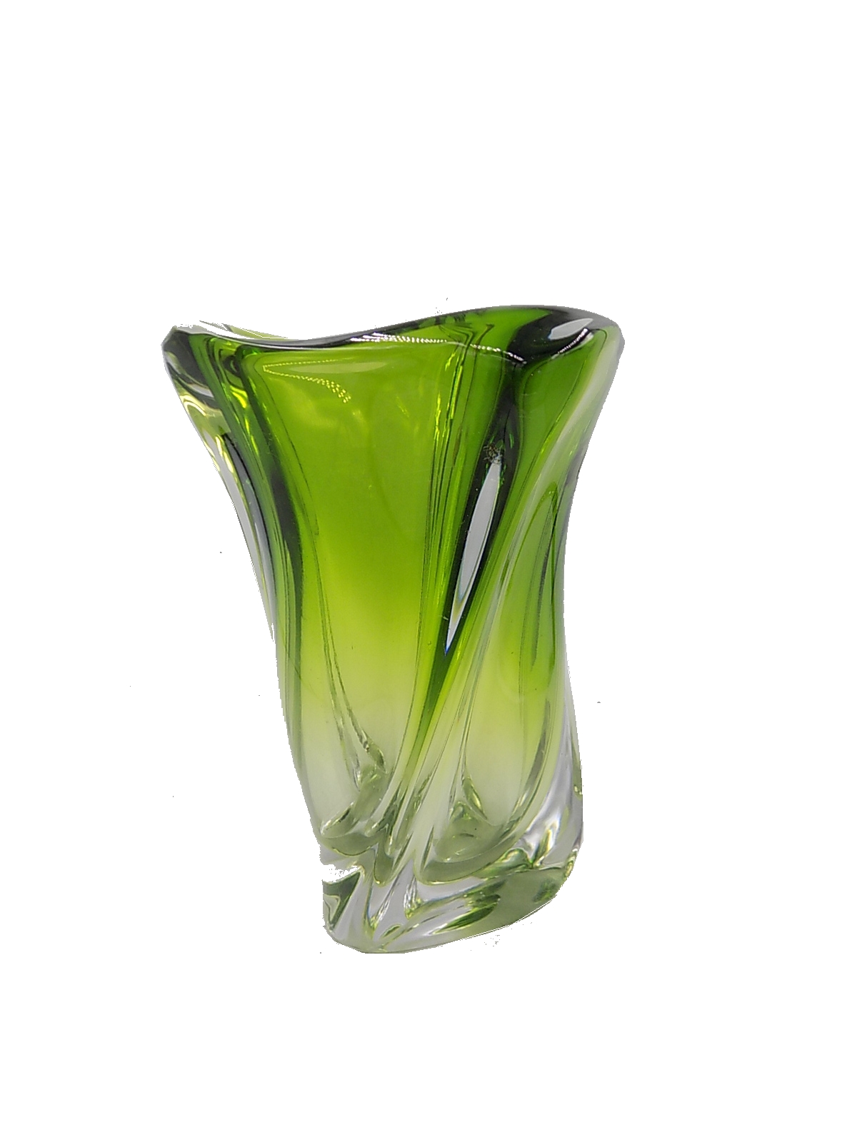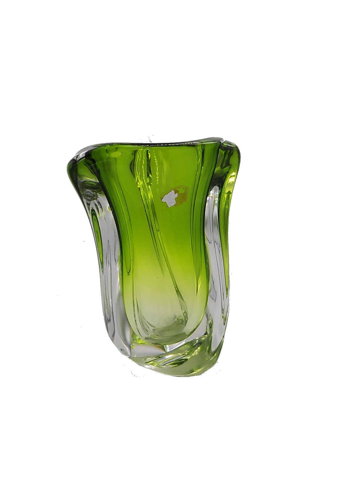 Wazon z cenionej belgijskiej huty szkła prawdopodobnie z lat 50/60-tych. Zachowała się częściowo etykieta. Wymiary;wys.27 x 20,5 x 17 cm.