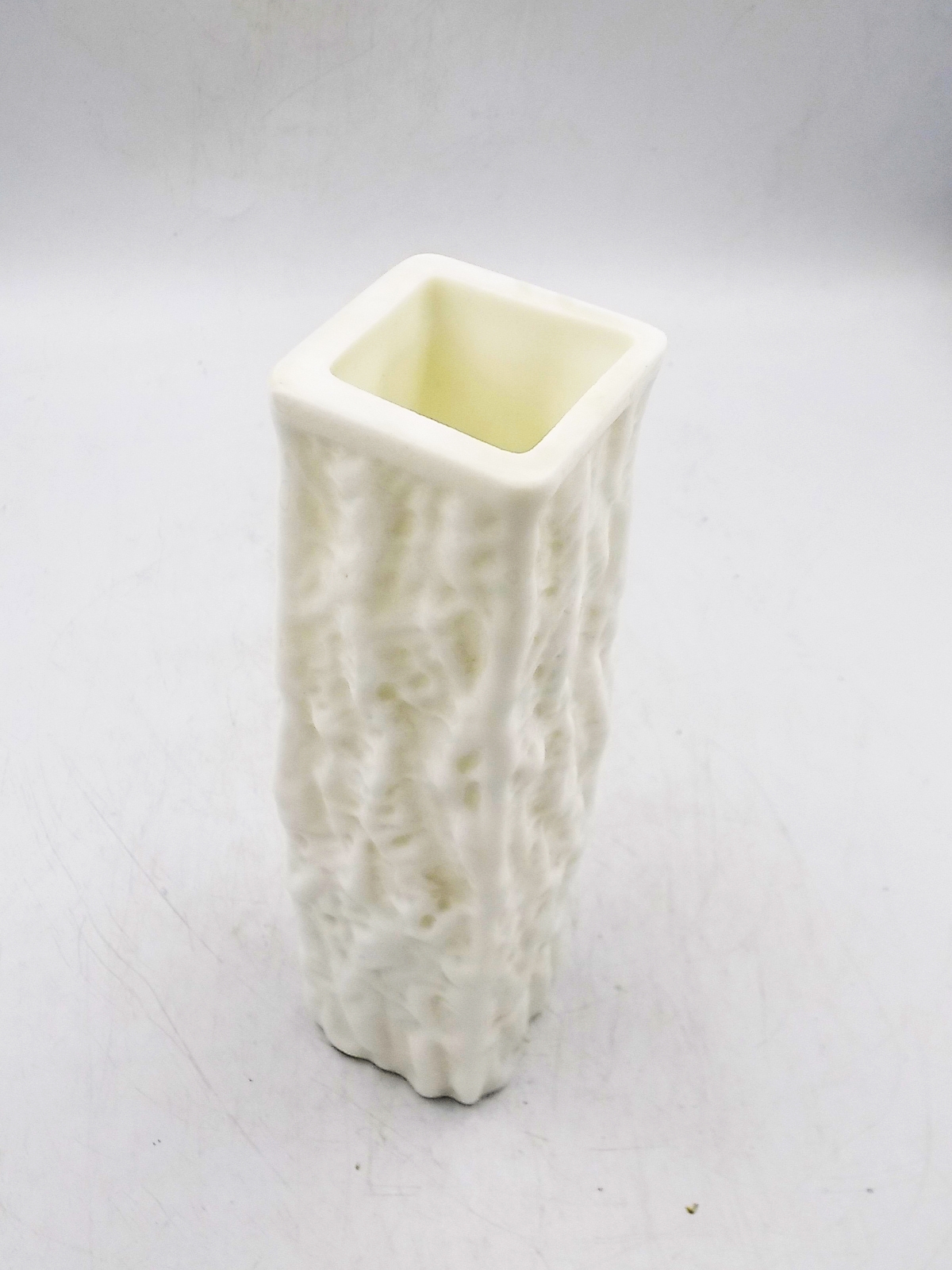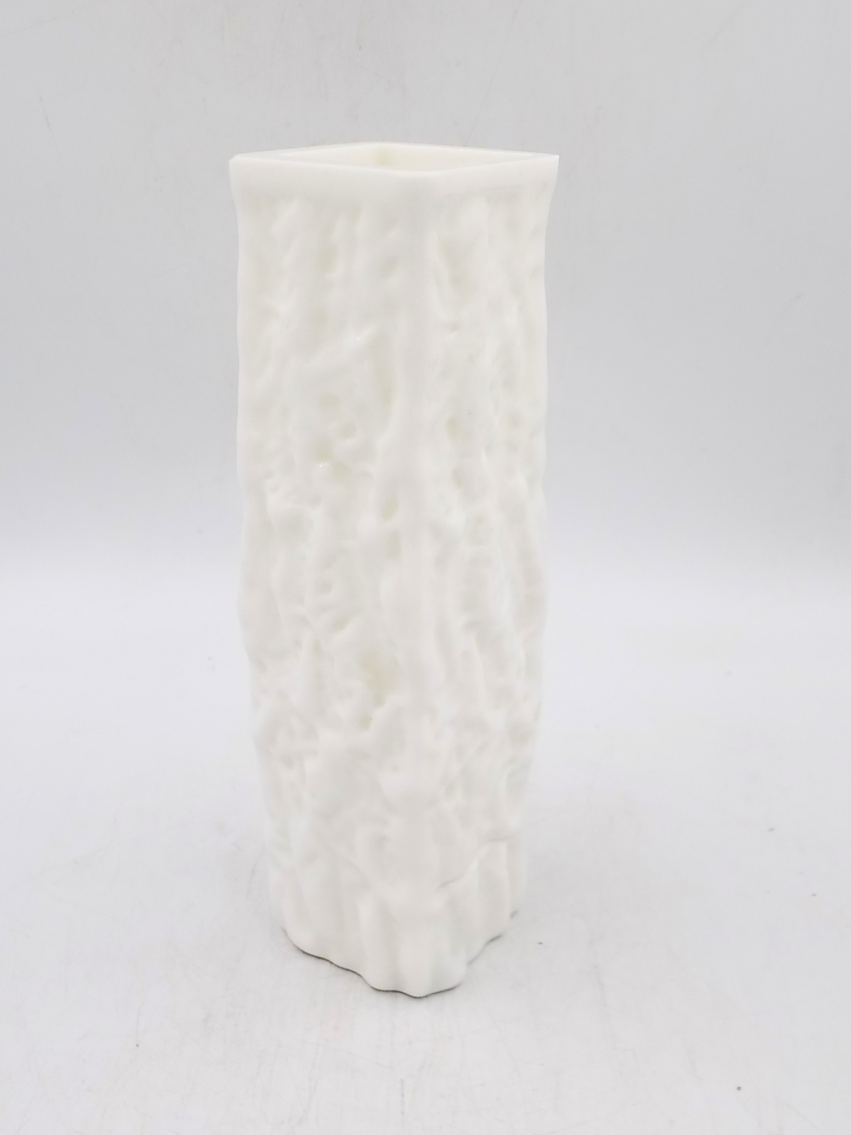 Wazon z mlecznego szkła prasowanego o lodowej strukturze. Pochodzi prawdopodobnie z Huty Ingrid Glass z II poł.XX w. Wymiary; 20,5 x 6 x 6 cm.