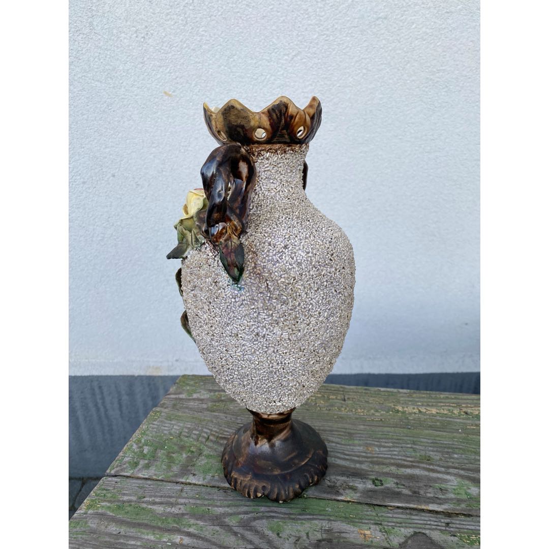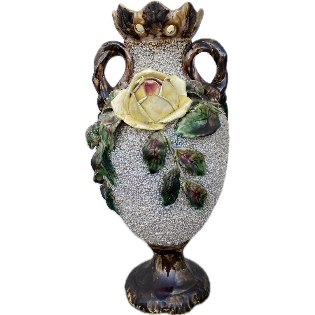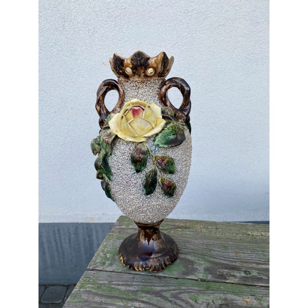 Majolikowy wazon z fajansu włocławskiego z okresu międzywojennego. Dobry stan. Wymiary; wys. 32 cm.