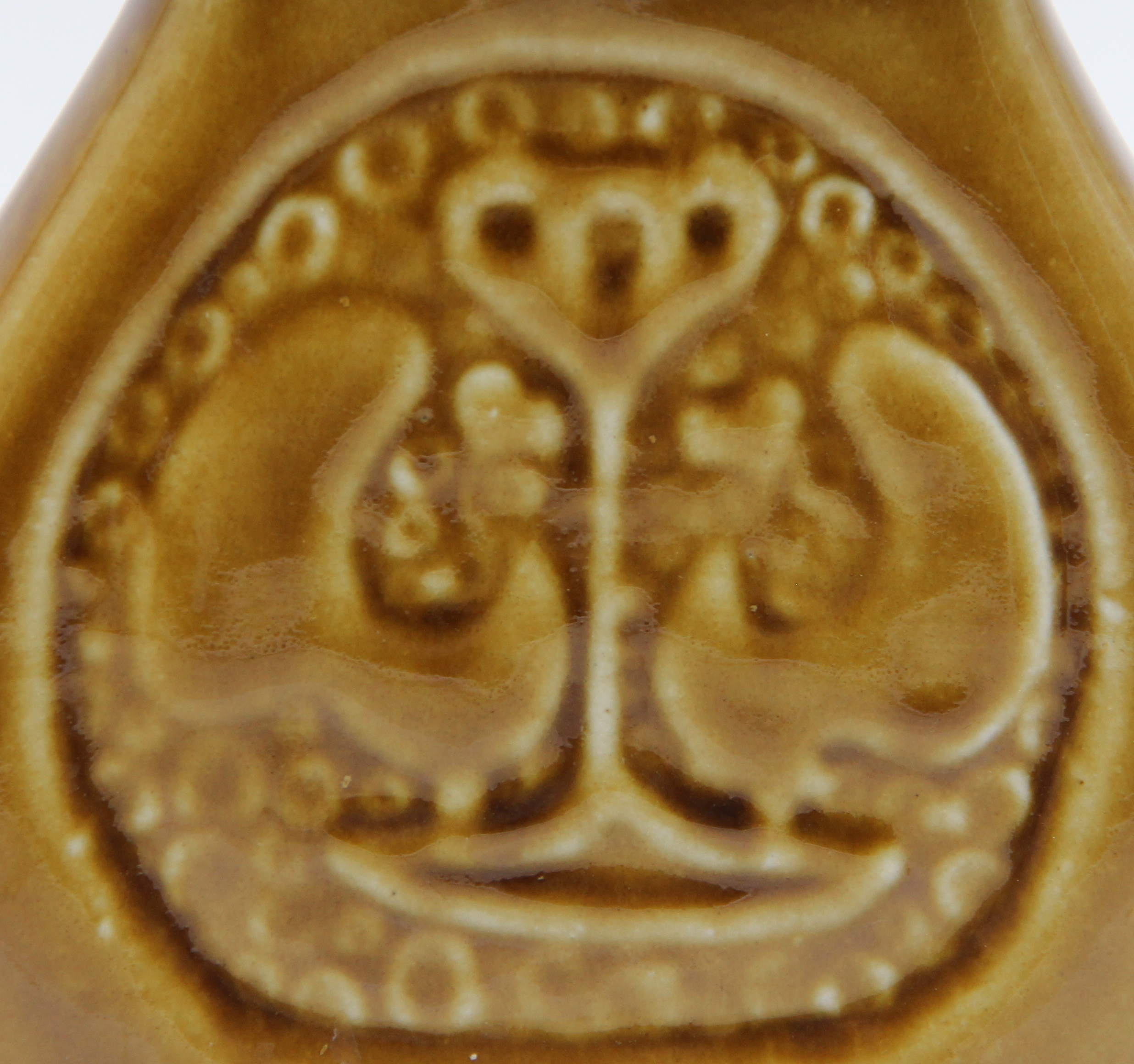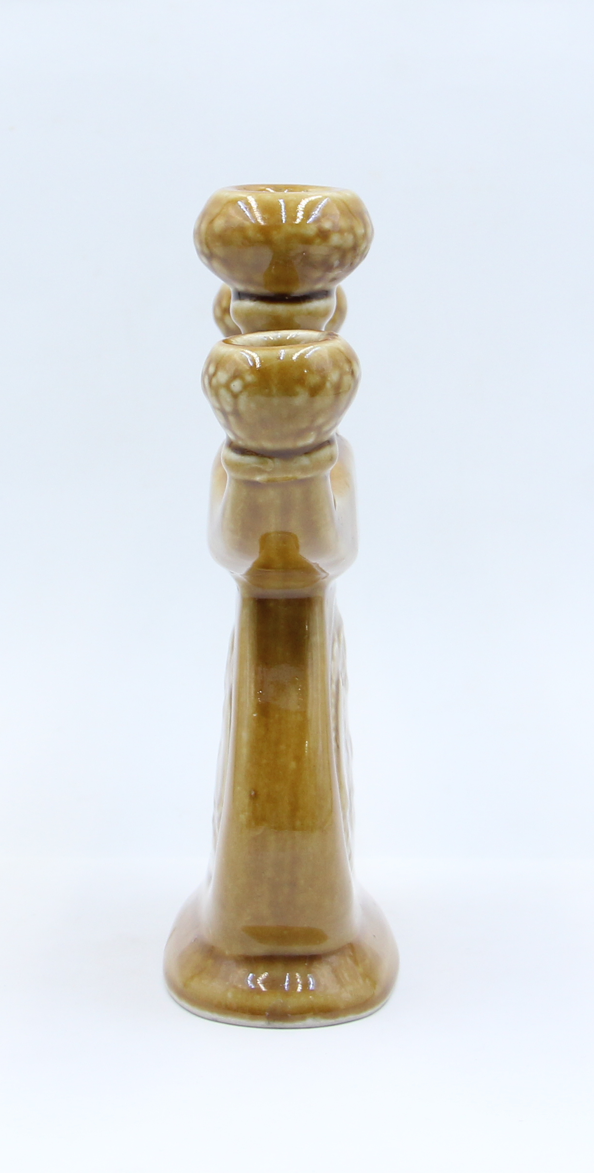 Duży, trójramienny kamionkowy świecznik “Koguty”, wyprodukowany prawdopodobnie przez Zakłady Naczyń Kamionkowych “Bochnia” w Bochni w latach 60-tych.