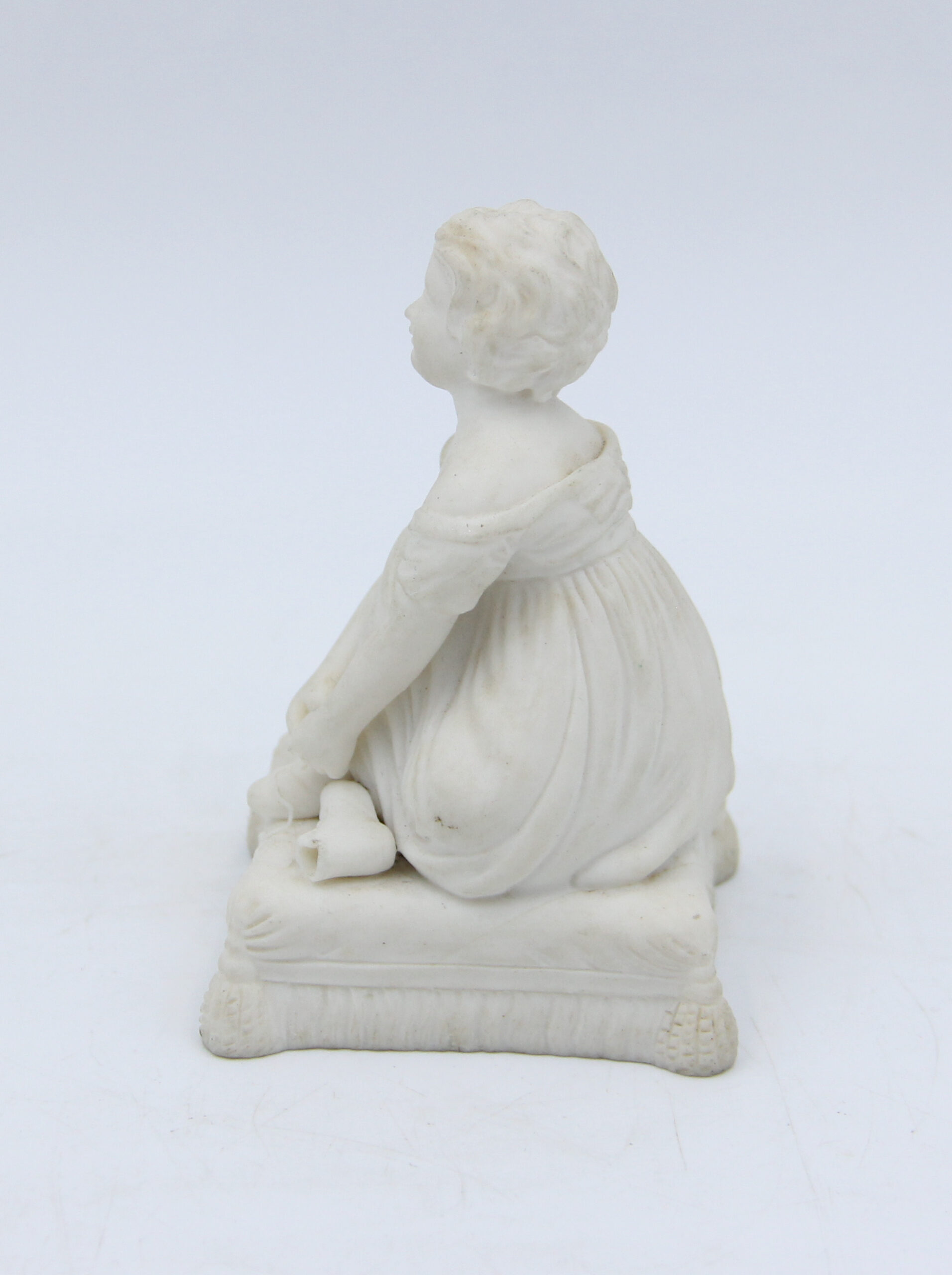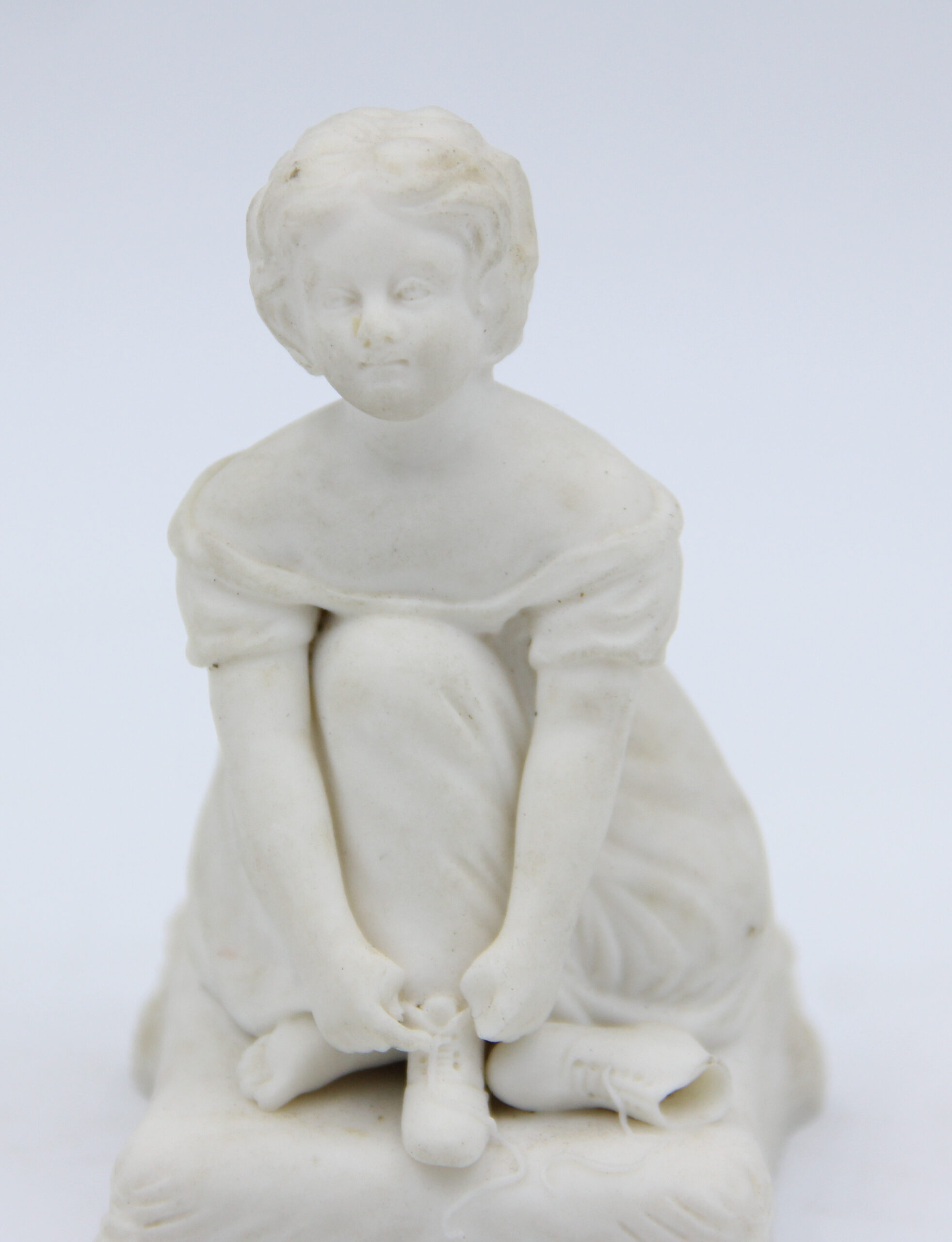Figurka z terakoty prawdopodobnie z XIX w przedstawiająca kobietę zakładającą buty. Wiernie oddane szczegóły. Sygnowana. Ślady użytkowania.