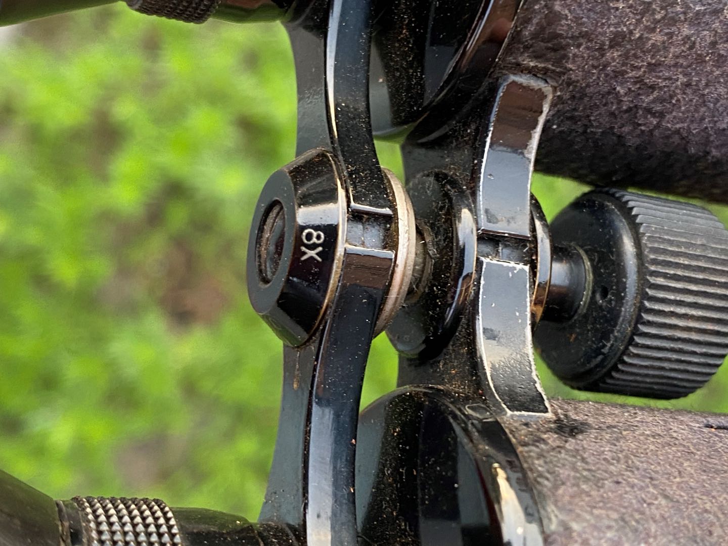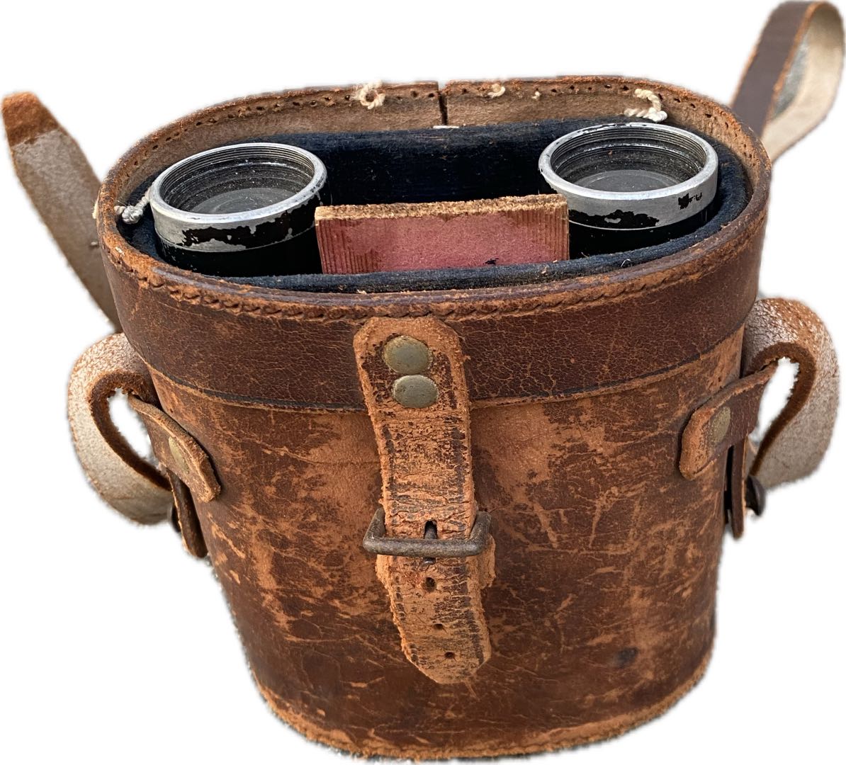 Lornetka w skórzanym etui. Etui uszkodzone. Wymiary; wys.12,5 x 10 x 4 cm