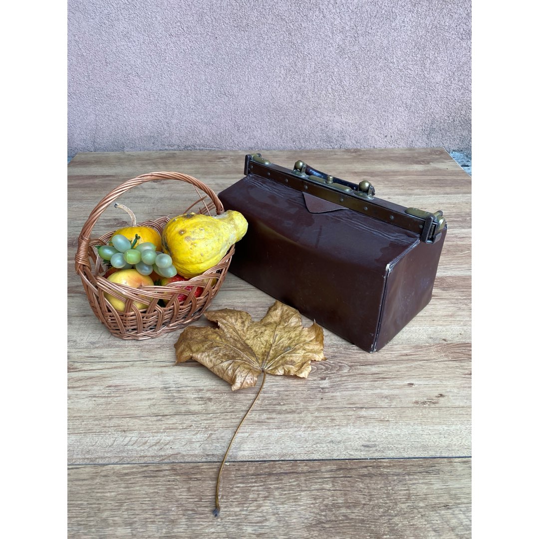 Zabytkowa torba lekarska ze skóry i z metalowymi okuciami z I poł. XX w. Dobry stan. Brak kluczyka. Wymiary; wys.21 x 20 x 41 cm.